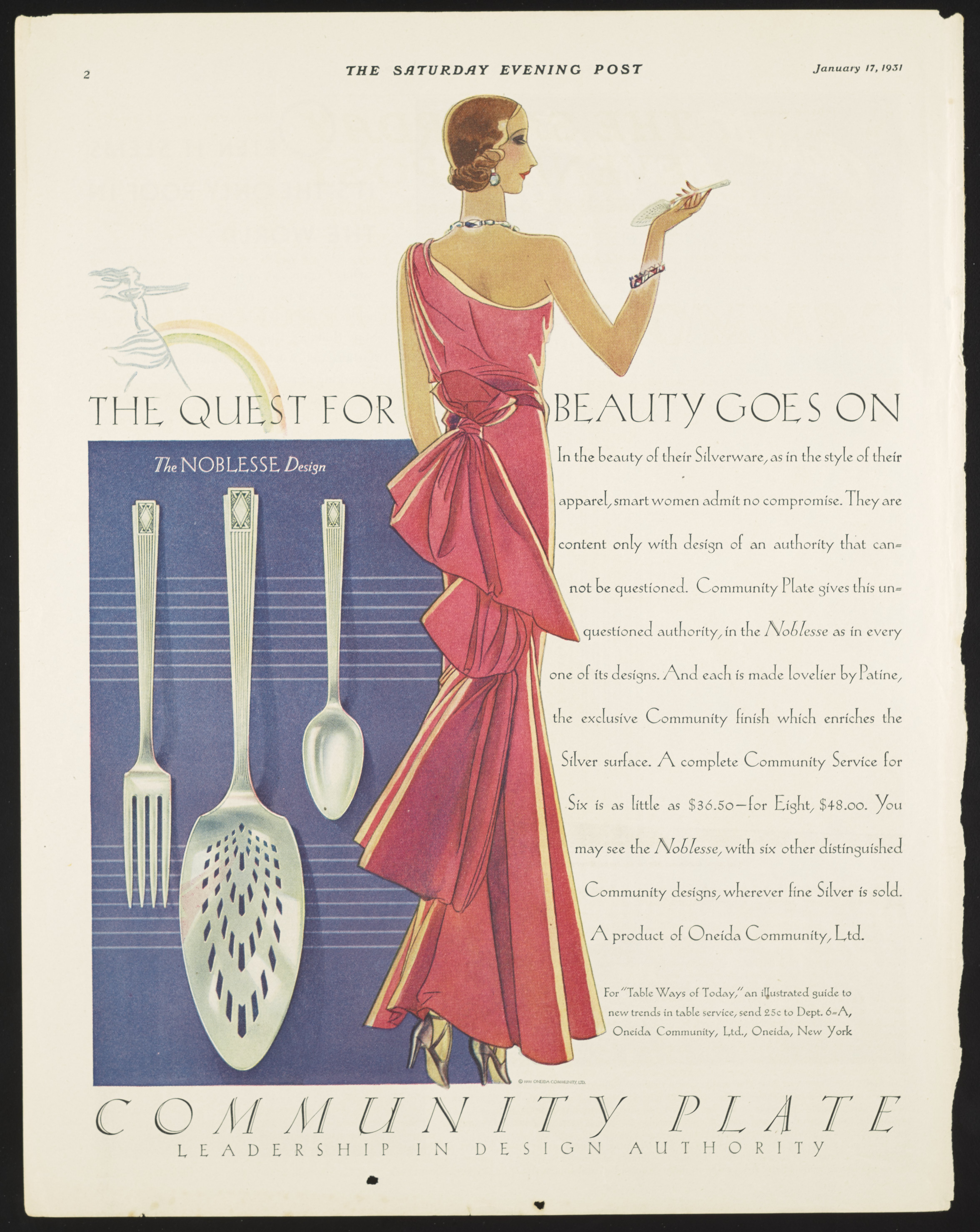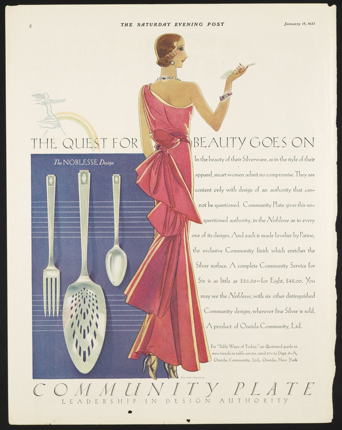 Color print magazine advertisement for Community Plate silverware. Illustration depicts a woman in a red dress holding a silver spoon, as well as fine silver of the "Noblesse Design." This ad appeared in The Saturday Evening Post, January 17, 1931.