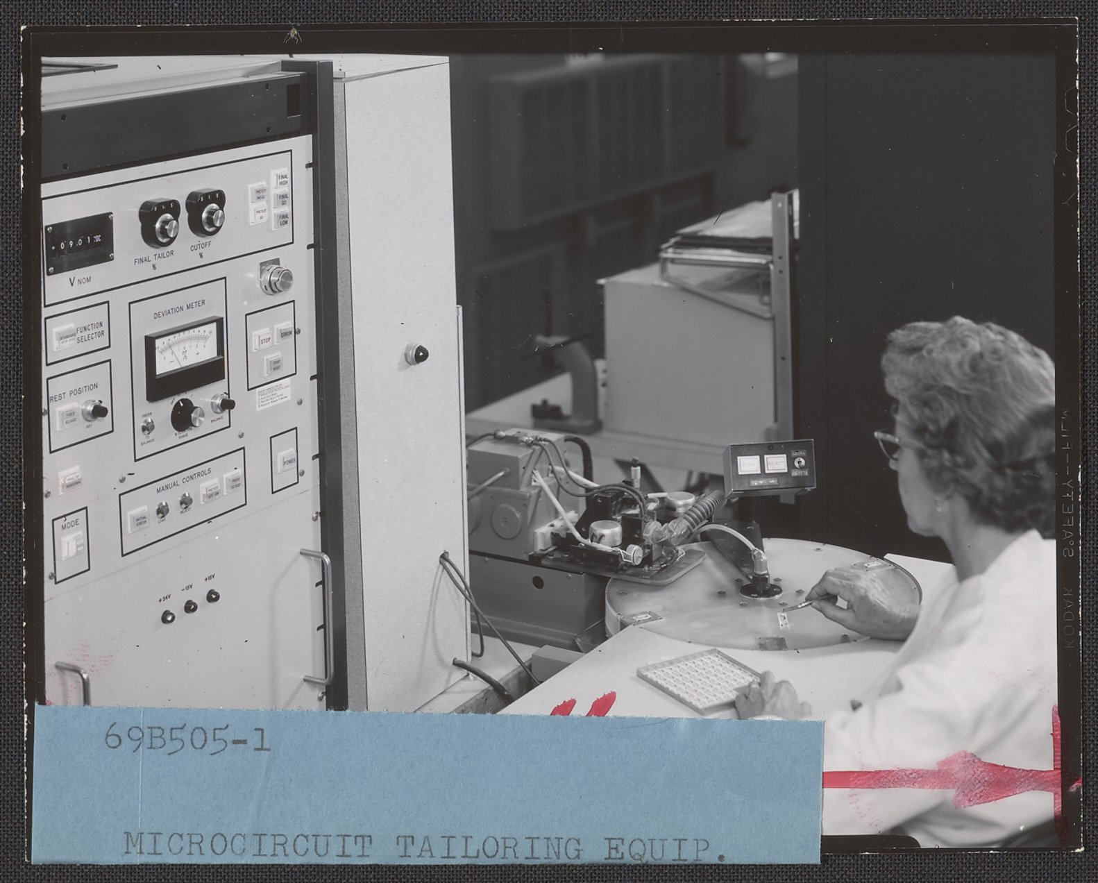 Woman using Helipot microcircuit tailoring equipment
