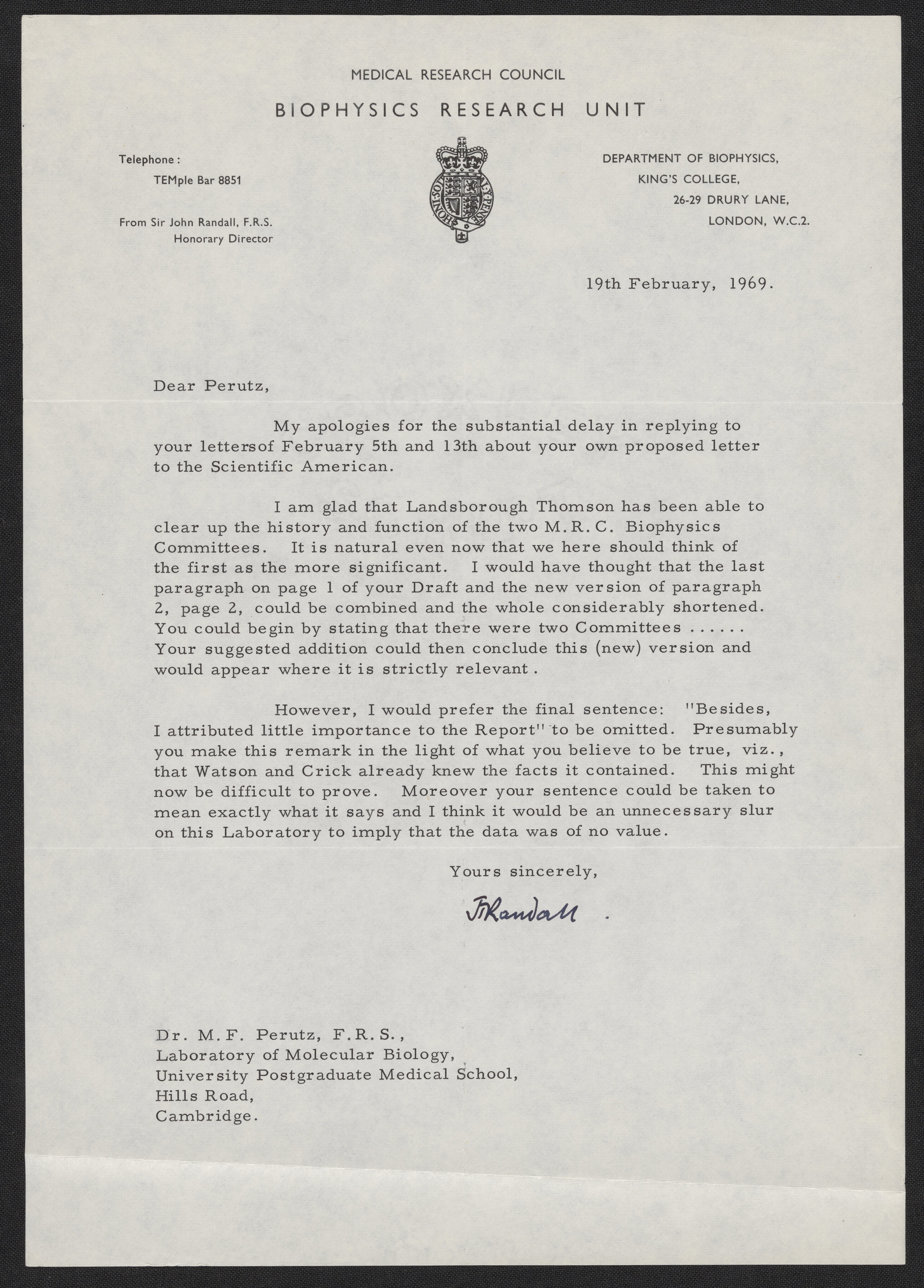 Letter from John Randall to Max Perutz, February 19, 1969