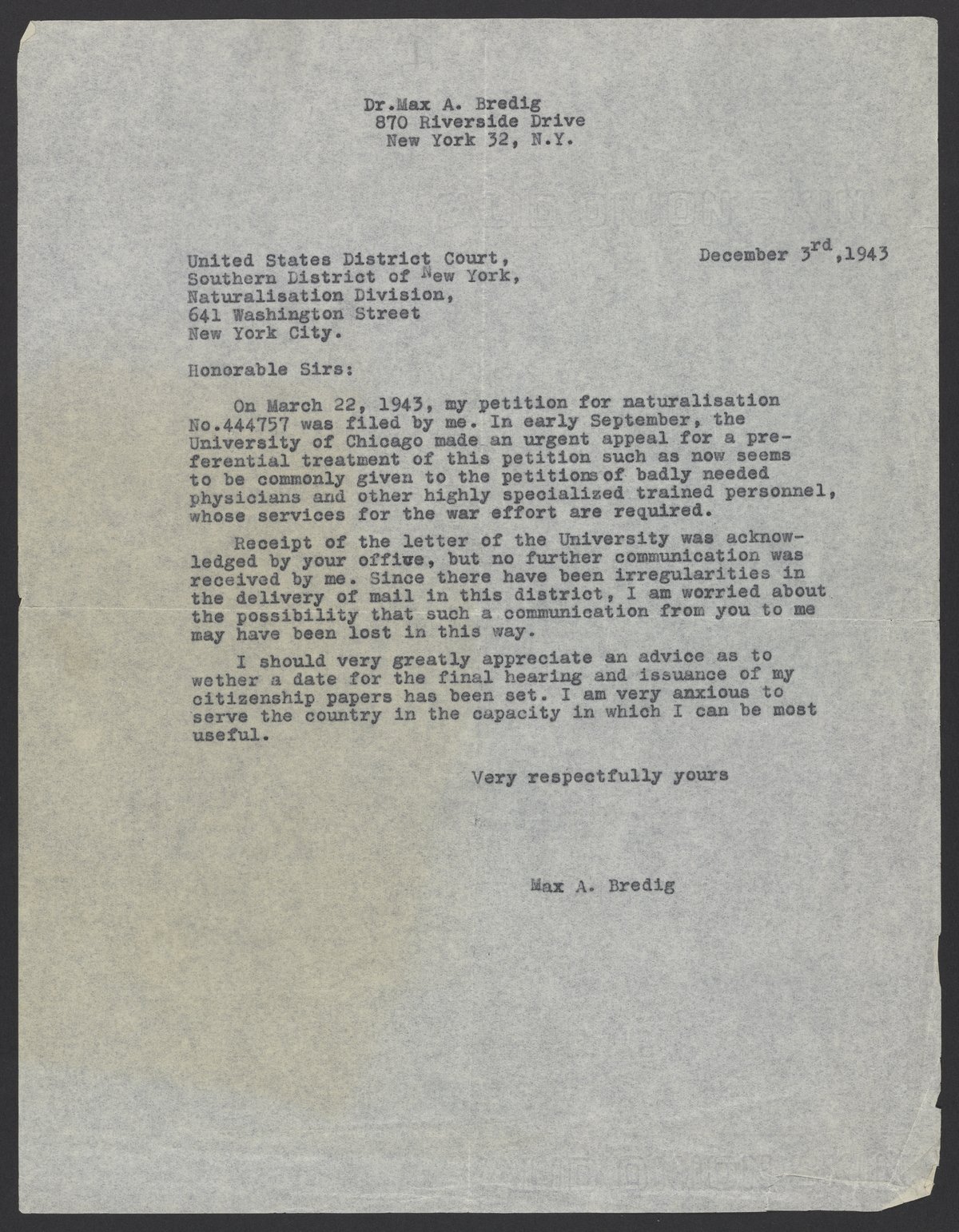 Letter from Max Bredig to the United States district court of New York, December 3, 1943