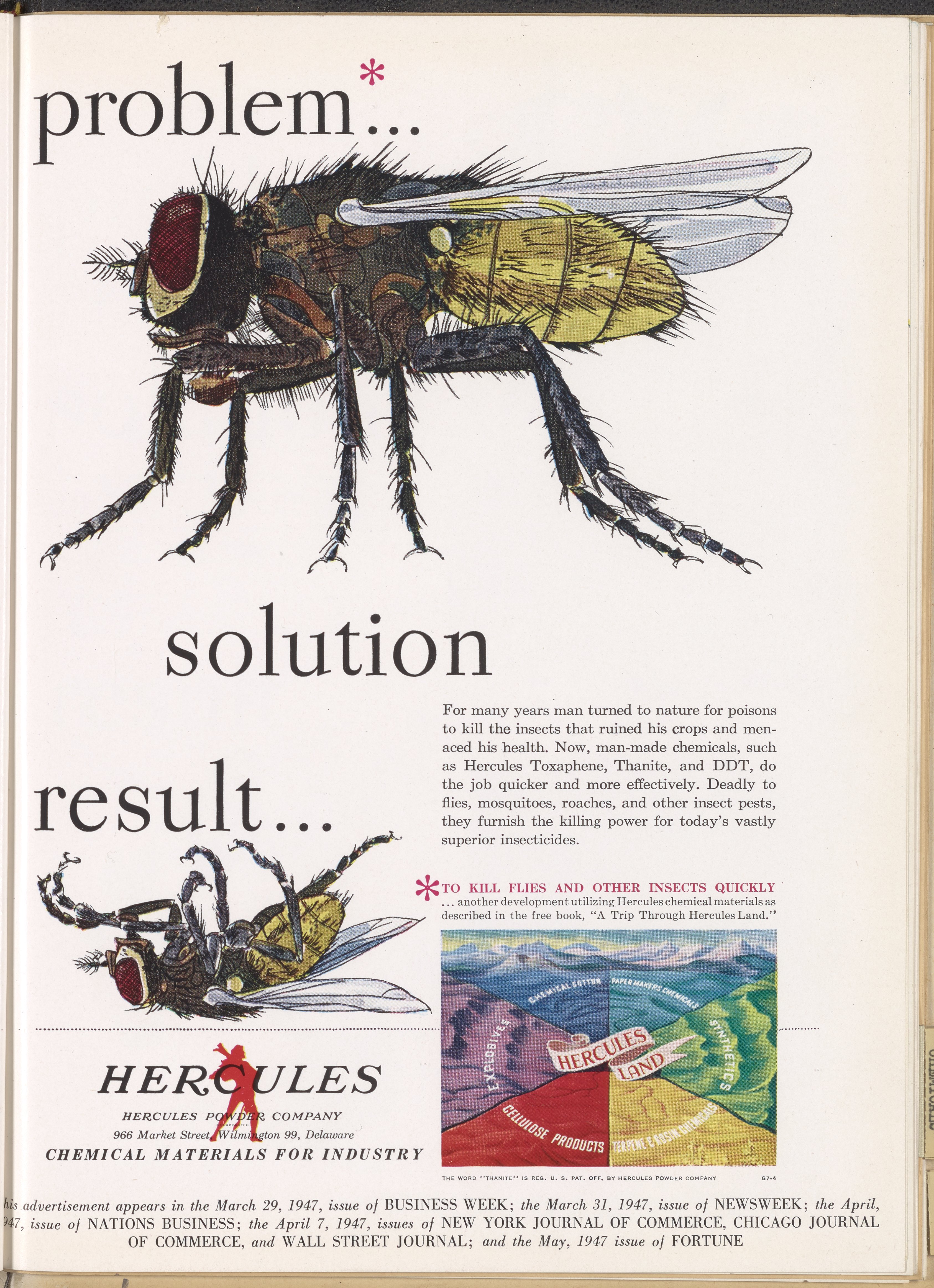 Advertisement for insecticides such as Toxaphene, Thanite, and DDT manufactured and sold by the Hercules Powder Company. This advertisement appeared in the March 29, 1947 issue of Business Week; the March 31, 1947 issue of Newsweek; the April 1947 issue of Nations Business; the April 7, 1947 issues of the New York Journal of Commerce, the Chicago Journal of Commerce, and the Wall Street Journal; and the May 1947 issue of Fortune.