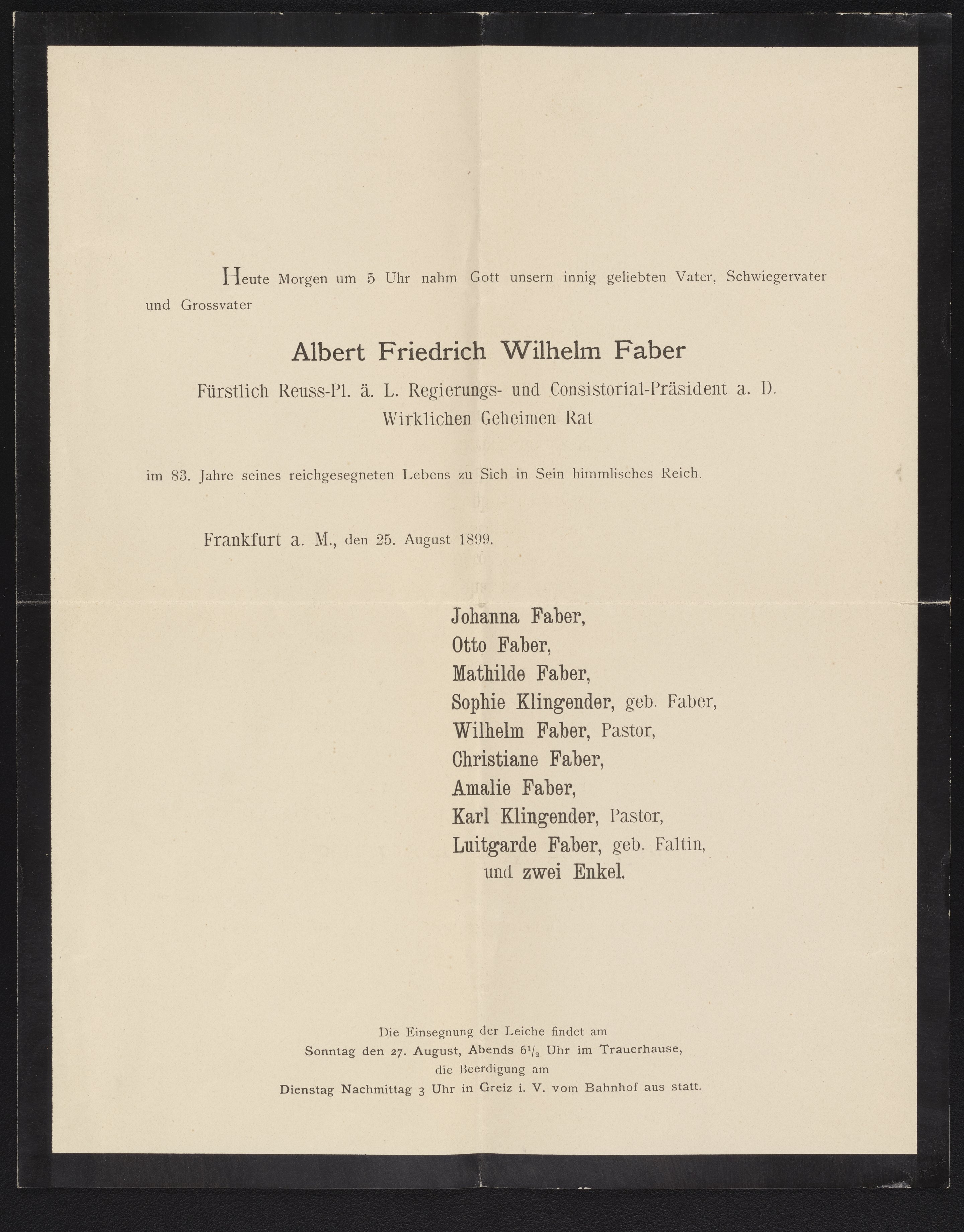 Memorial Announcement for Albert Friedrich Wilhelm Faber