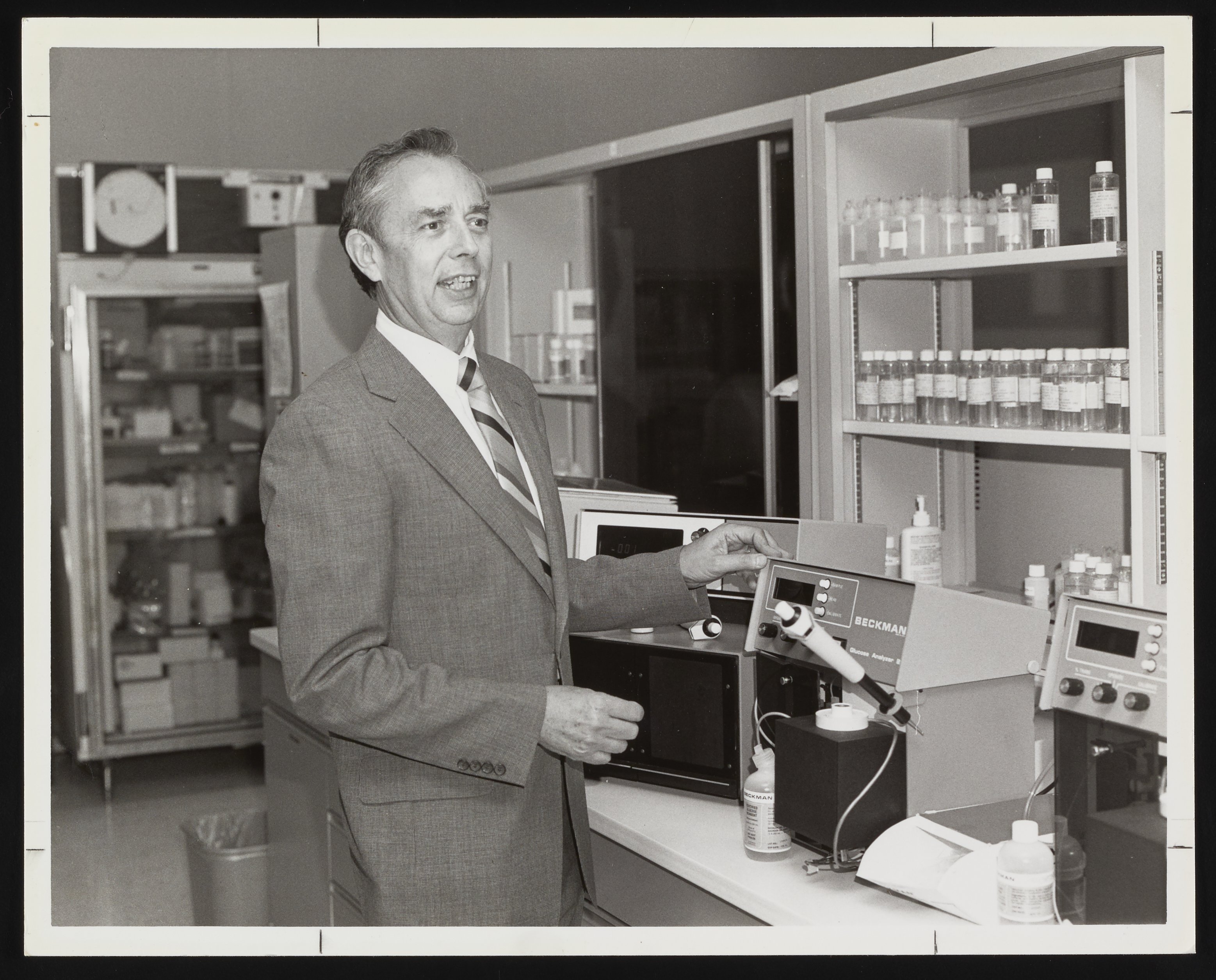 “Dr. Sternberg with Glucose Analyzer 2,” circa 1979. Beckman Historical Collection, Box 87. Science History Institute. Philadelphia. https://digital.sciencehistory.org/works/cv43nw94v.