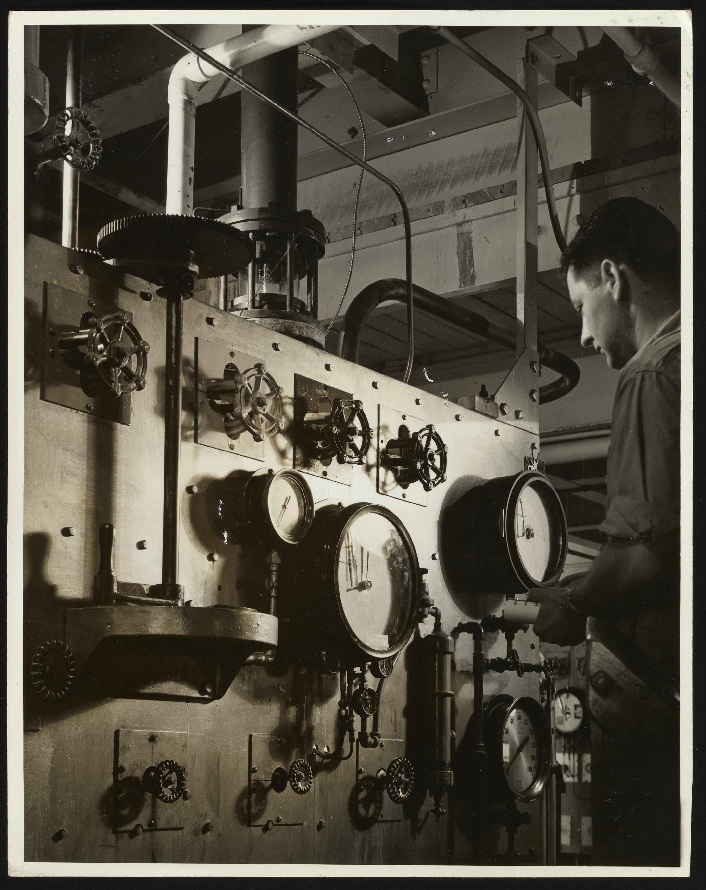Hercules Incorporated. “Employee Examining Control Panel at Hercules Hopewell Plant,” 1940–1949. Photographs from the Records & Ephemera of Hercules Incorporated, Box 1, Folder 35. Science History Institute. Philadelphia. https://digital.sciencehistory.org/works/cv43nx53t.