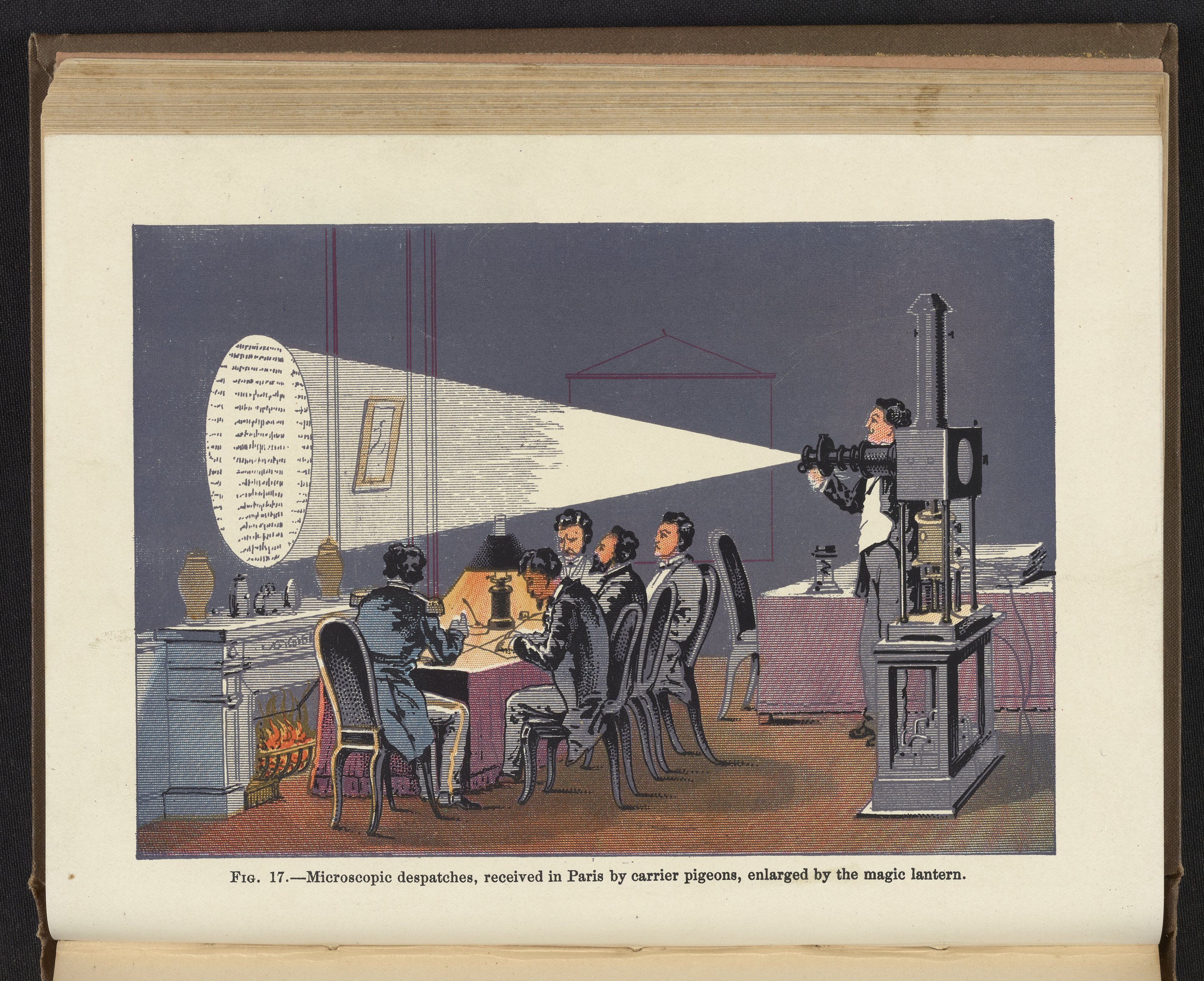 Color plate depicts a man operating a magic lantern, specifically the Duboscq Megascope, to discern microscopic dispatches delivered in Paris by carrier pigeons. Homing pigeons were utilized for communication during the Siege of Paris in 1870 when Parisians were surrounded by German armies, preventing correspondence with the outer world. The pigeons carried a microfilmed dispatch which could be read upon magnification via a magic lantern projector, as pictured in this illustration.