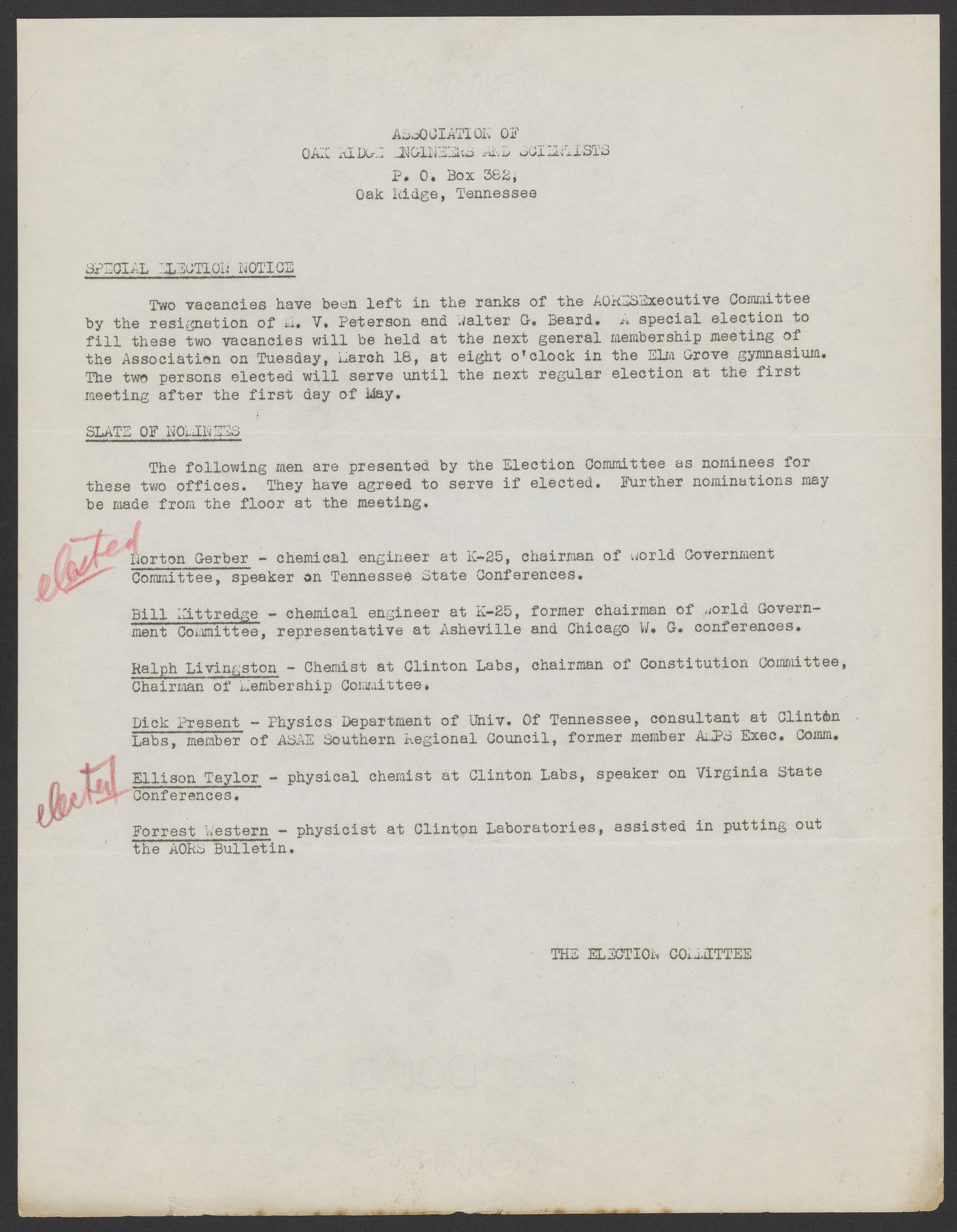 Special election notice for two new members of the executive committee of the Association of Oak Ridge Engineers and Scientists (AORES). Following the notice is a list of nominees and a small biography. Max Albert Bredig (1902-1977) marked the two individuals who were elected, Norton Gerber and Ellison Taylor(1913-).