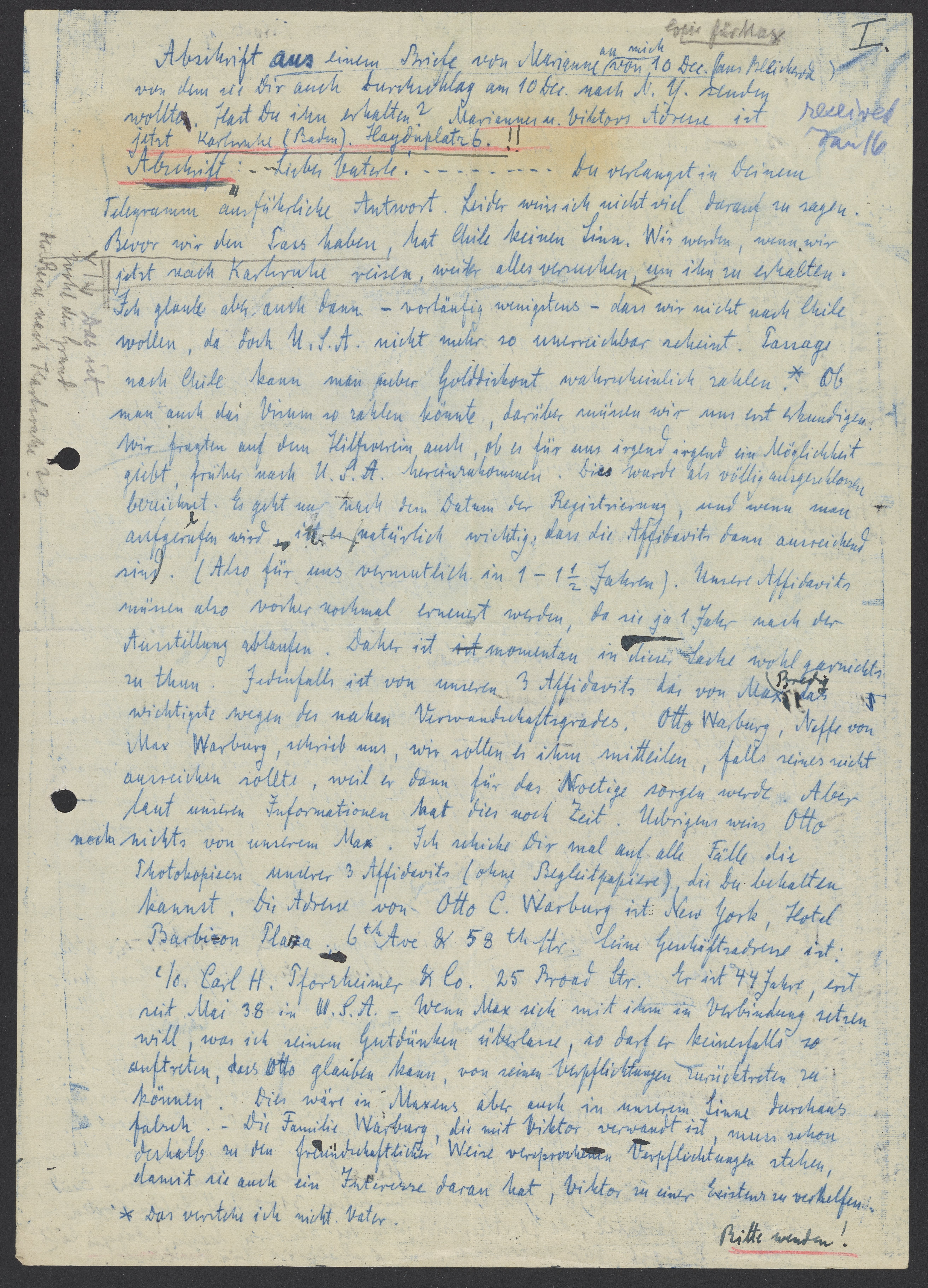Letter from Georg Bredig to Max Bredig, January 16, 1940