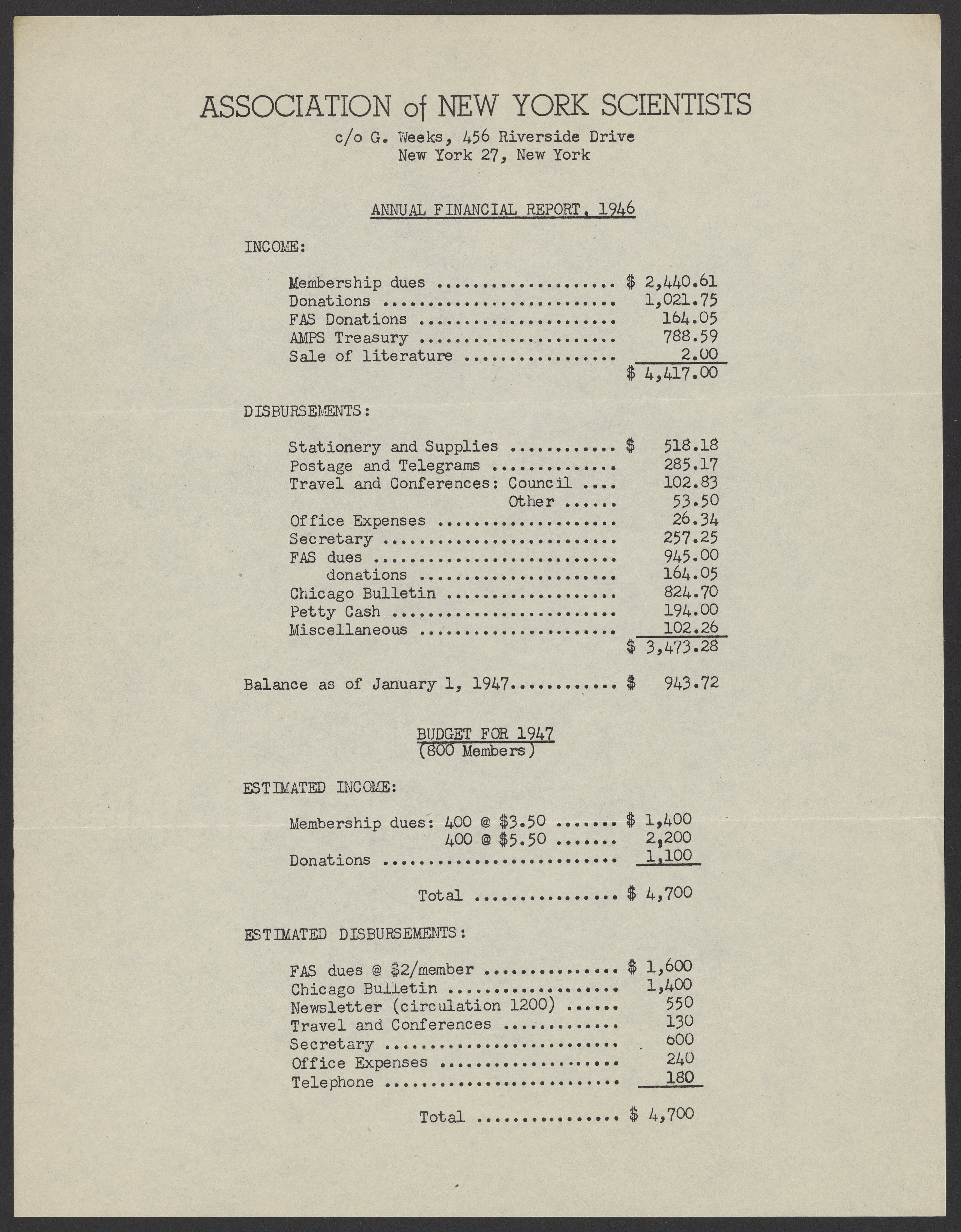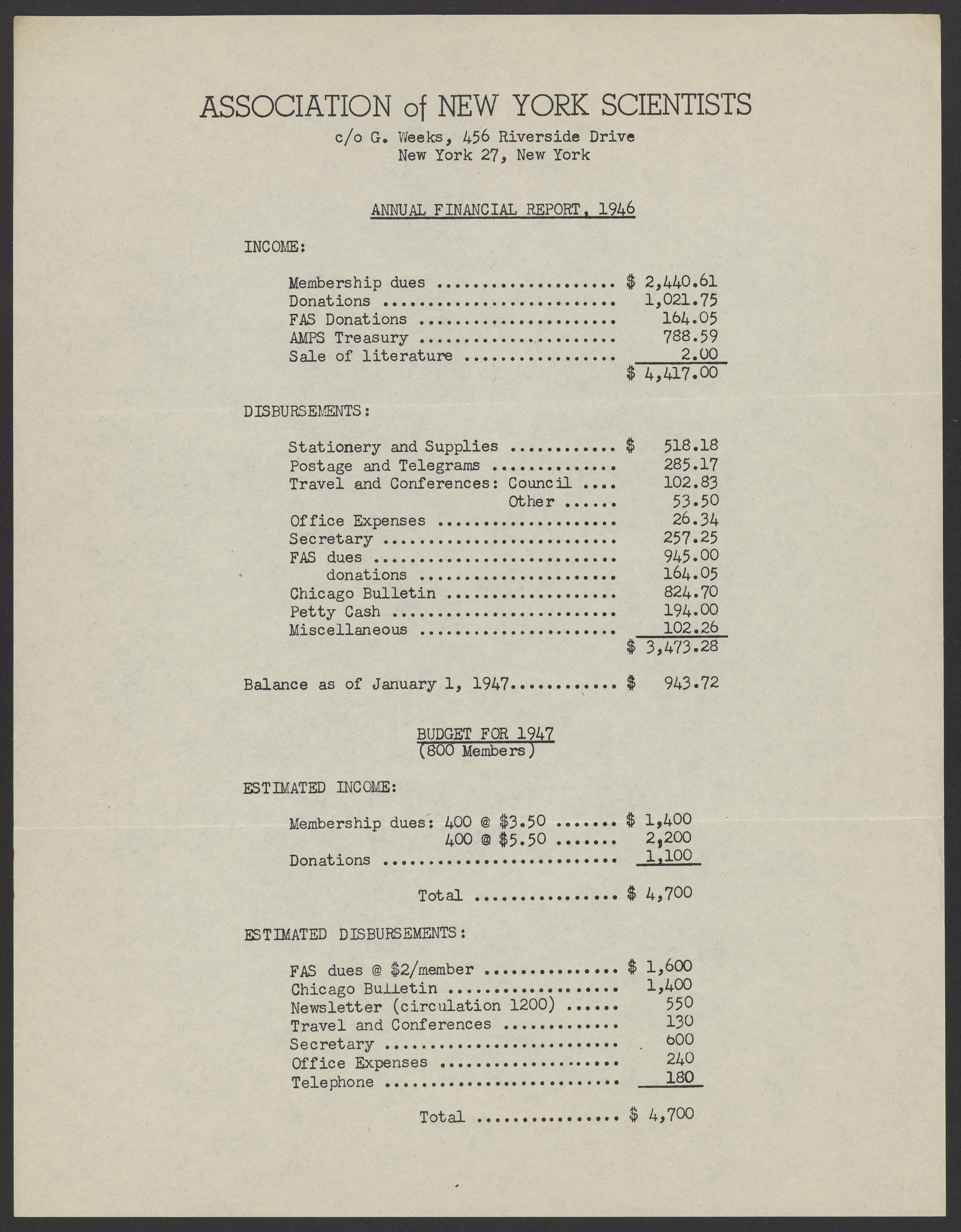 Annual financial report of the Association of New York Scientists, 1946