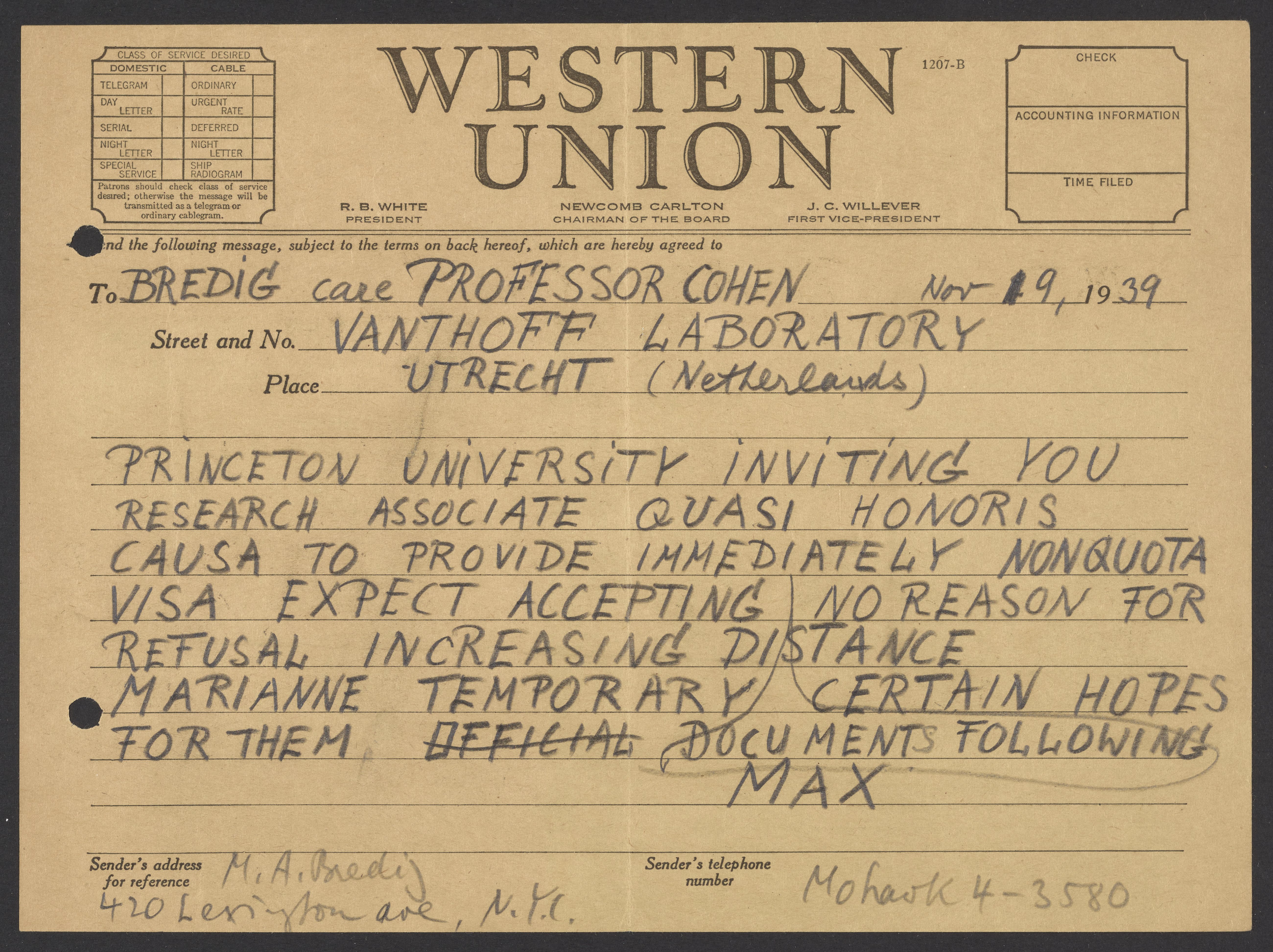 Small JPG1200 x 898px — 227 KBLarge JPG2880 x 2154px — 1.2 MBFull-sized JPG5200 x 3890px — 3.7 MBOriginal fileTIFF — 5200 x 3890px — 57.9 MBTelegram from Max Bredig (1902-1977) to Georg Bredig (1868-1944) telling him that Princeton University is offering him a position as a research associate and there is no reason to refuse. This position allowed Bredig to emigrate from Europe to the United States.