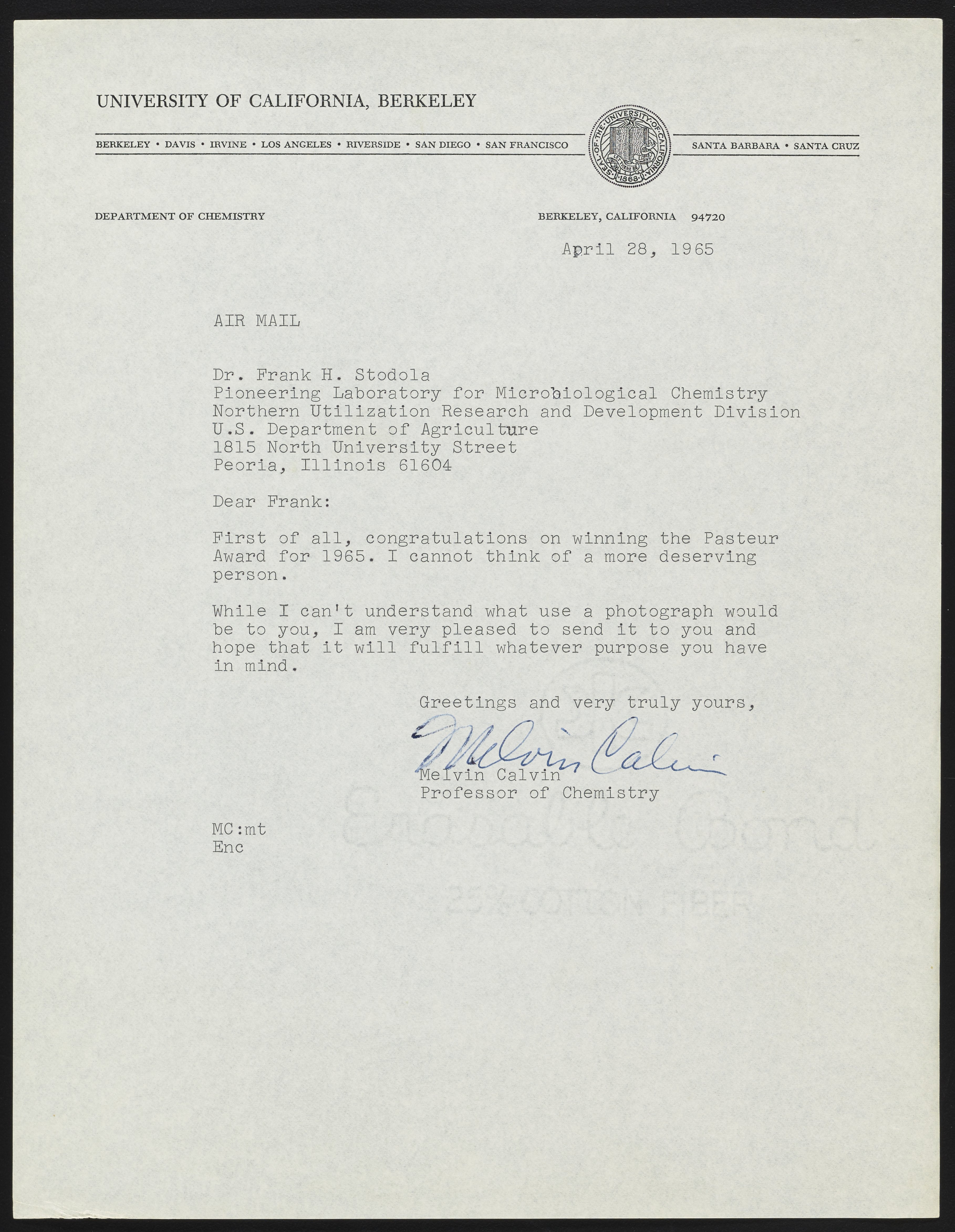 Calvin, Melvin. “Letter from Melvin Calvin to Frank Stodola,” April 28, 1965. Frank H. Stodola Nobel Laureate Letter Collection, Box 1. Science History Institute. Philadelphia. https://digital.sciencehistory.org/works/cz30ps70h.