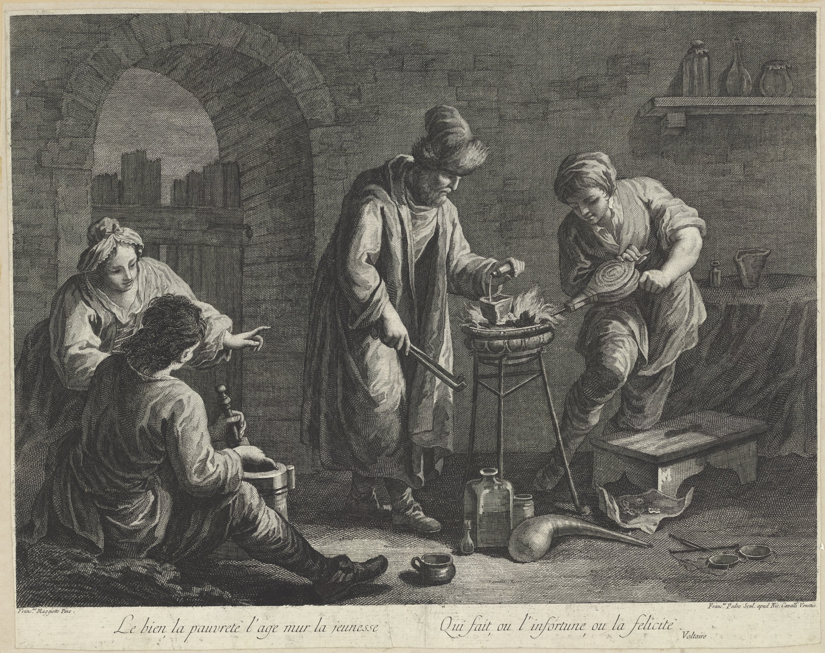 This etching by Francesco Pedro, for Nicollo Cavalli of Venice, reproduces a painting by Francesco Maggiotto. The scene shows four individuals in a humble workroom, gathered around a brazier full of coals. The central figure, a bearded alchemist in a tall cap and robes, holds a pair of tongs as he pours liquid into a heating crucible. A younger man beside him fans the flames with a pair of bellows, while another young man and woman converse nearby. An alembic and a pair of scales rest on the floor at their feet. The inscription below the print quotes the French poet and philosopher Voltaire: "Le bien, la pauvreté, l'âge mûr, la jeunesse. Qui fait ou l'infortune ou la félicité." (Goodness, poverty, middle age, youth. Who makes of it misfortune or happiness.)
