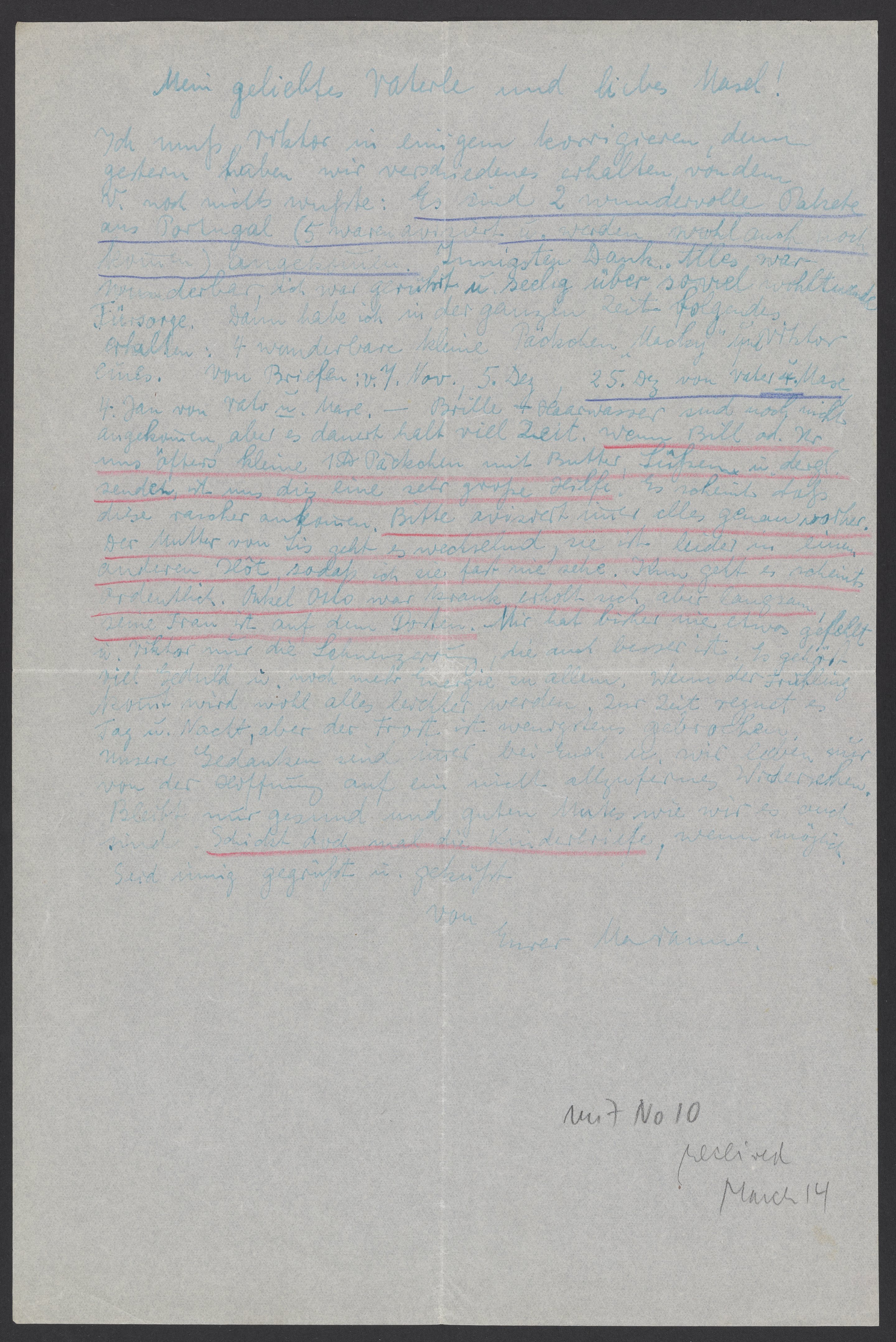 Ich muss vorher in einigem korrigieren, denn gestern haben wir verschiedenes erhalten, von dem V. noch nichts wußte: Es sind 2 wundervolle Pakete aus Portugal (5 waren avisiert u. werden wohl auch noch kommen) angekommen. Innigsten Dank. Alles war wunderbar, ich war gerührt u. seelig über soviel wohltuende Fürsorge. Dann habe ich in der ganzen Zeit folgendes erhalten: 4 wunderbare kleine Päckchen u. Macky und Viktor eins. Von Briefen: v. 7. Nov., 5. Dez, 25. Dez von Vater u. Max, 4. Jan. von Vater u. Max. – Brille & Haarwasser sind noch nichts angekommen, aber es dauert halt viel Zeit. Wenn Bill od. Ihr uns öfters kleine 1 lb. Päckchen mit Butter, Seifen u. dergl. Senden, ist uns dies eine sehr große Hilfe. Es scheint daß diese rascher ankommen. Bitte avisiert mich alles genau vorher. Der Mutter von Lis geht es wechselnd, sie ist leider in einem anderen Ilot, sodaß ich sie fas nie sehe. Ihm geht es scheints ordentlich. Onkel Otto war krank erholt sich aber langsam, seine Frau ist auf dem Dorfen. Mir hat bisher nie etwas gefehlt u. Viktor nur die Schmerzungen, die auch besser sind. Es gehört viel Geduld u. noch mehr Energie zu allem. Wenn der Frühling kommt, wird wohl alles leichter werden. Zur Zeit regnet es Tag u. Nacht, aber der Frost ist wenigstens gebrochen. Unsere Gedanken sind immer bei Euch und wir leben mit der Hoffnung auf ein allzufuernes Wiedersehen. Bleiben nur gesund und guten Mutes wie wir es auch sind. Schickt doch mal die Kinderbriefe, wenn möglich.