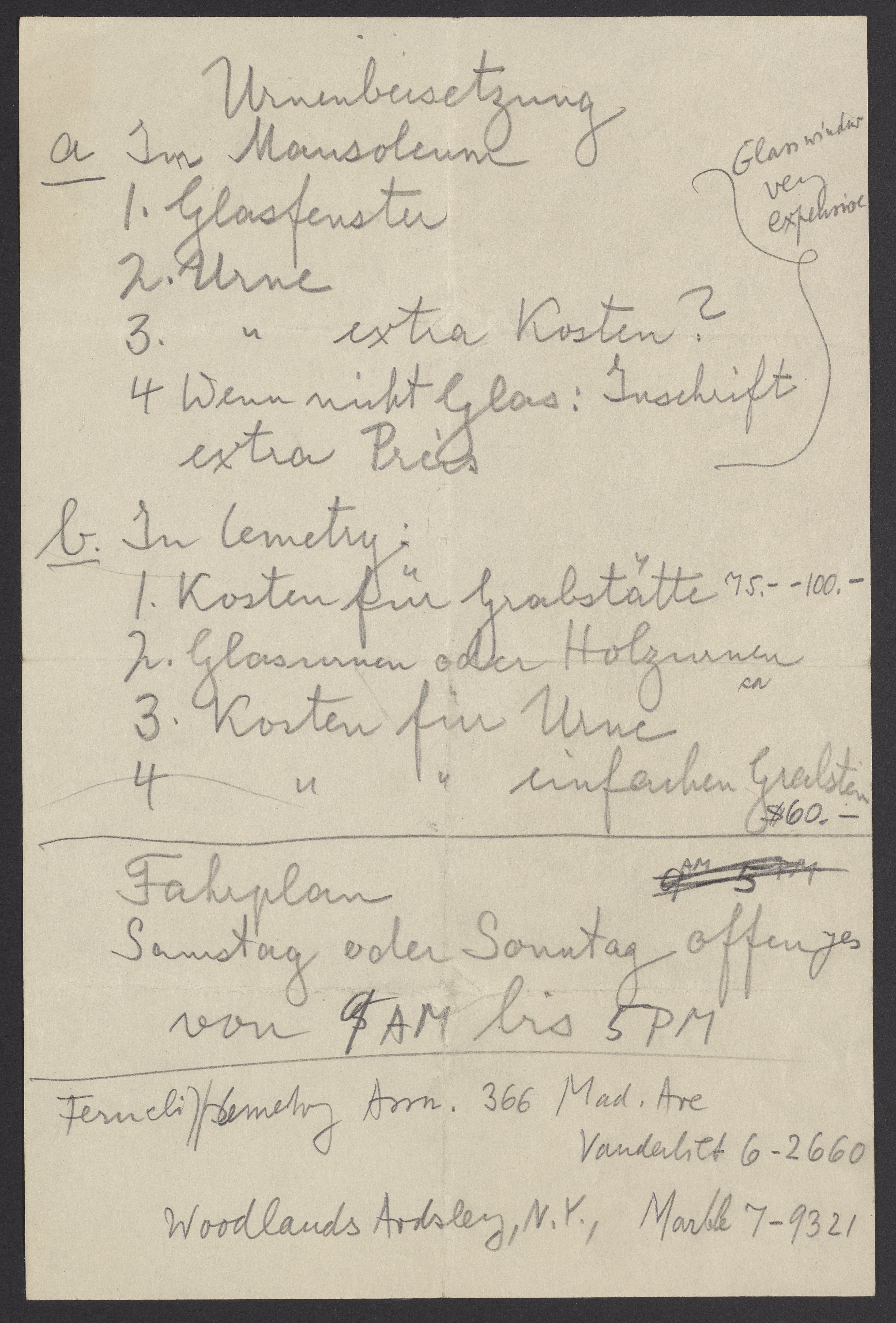 Note written by Max Albert Bredig (1902-1977) about burial plans for his late father, Georg Bredig (1868-1944). The note compares a mausoleum burial to a cemetery, and includes burial times, and addresses.