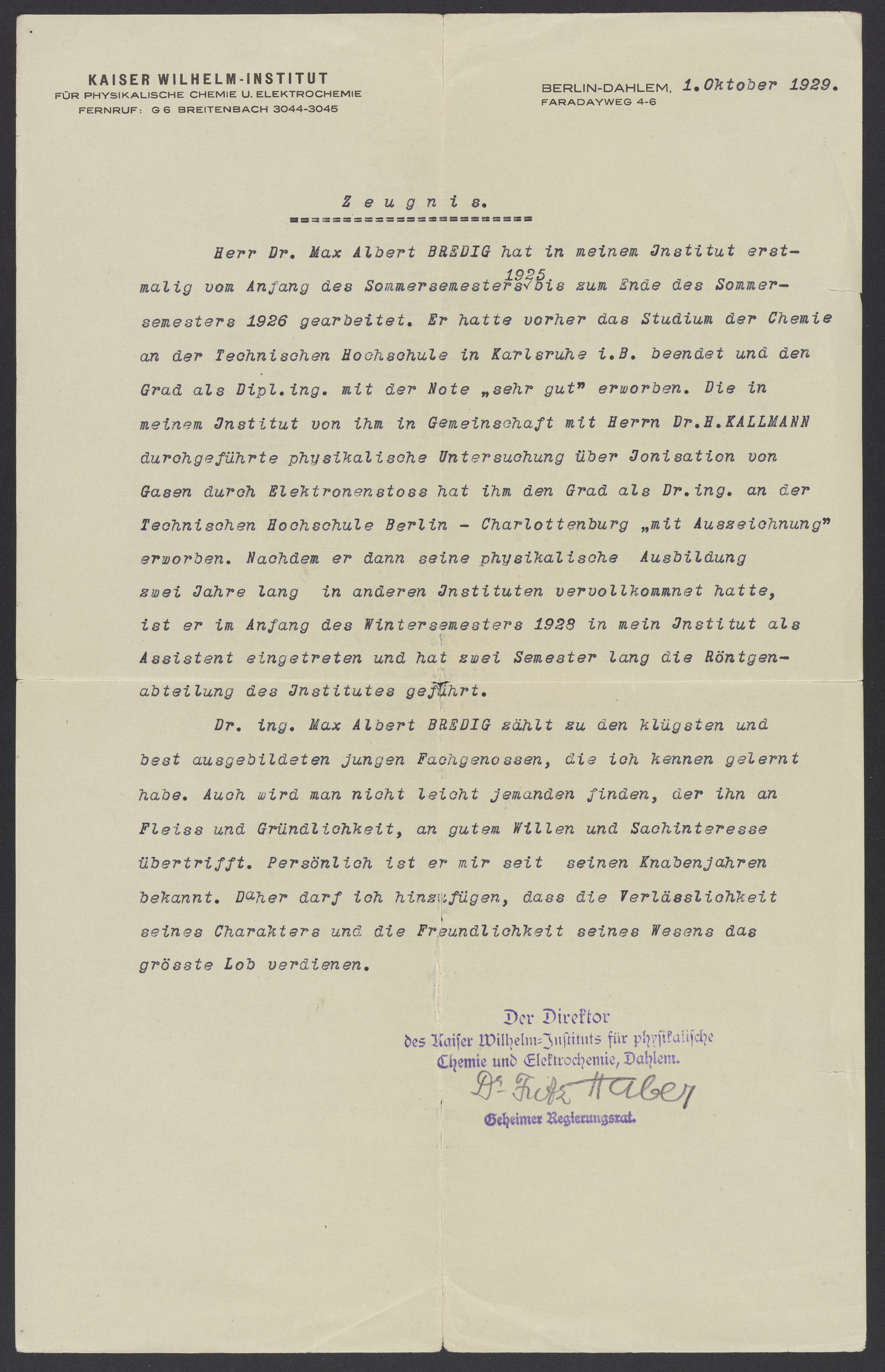 Herr Dr. Max Albert BREDIG hat in meinem Institut erstmalig vom Anfang des Sommersemesters 1925 bis zum Ende des Sommersemesters 1926 gearbeitet. Er hatte vorher das Studium der Chemie and der Technischen Hochschule in Karlsruhe i.B. beendet und den Grad als Dipl. ing. mit der Note „sehr gut“ erworben. Die in meinem Institut von ihm in Gemeinschaft mit Herrn Dr. H. KALLMANN durchgeführte physikalische Untersuchung über Ionisation von Gasen durch Elektronenstoss hat ihm den als Dr. ing. an der Technischen Hochschule Berlin – Charlottenburg „mit Auszeichnung“ erworben. Nachdem er dann seine physikalische Ausbildung zwei Jahre lang in anderen Instituten vervollkommnet hatte, ist er im Anfang des Wintersemesters 1928 in mein Institut als Assistent eingetreten und hat zwei Semester lang die Röntgenabteilung des Institutes geführt.