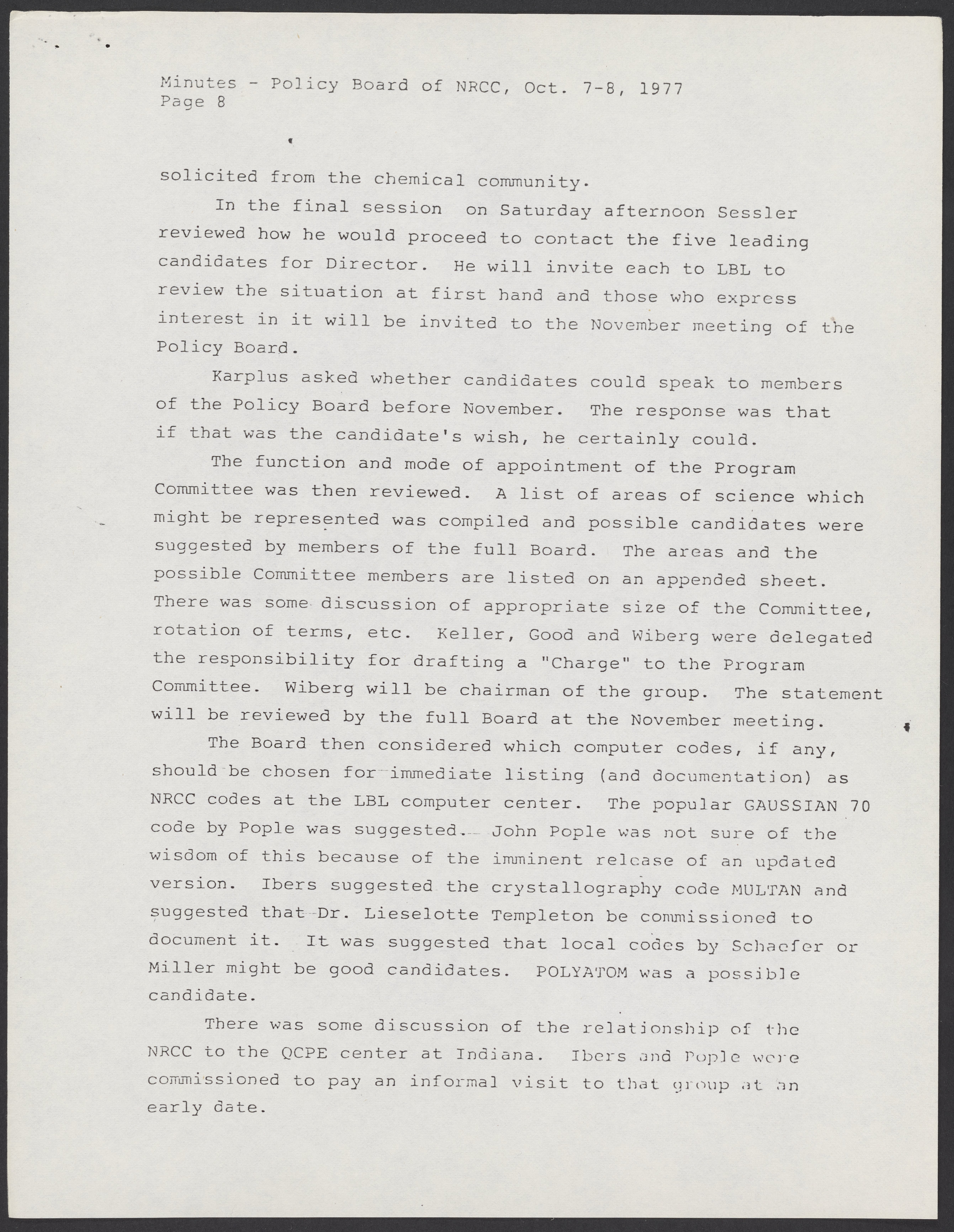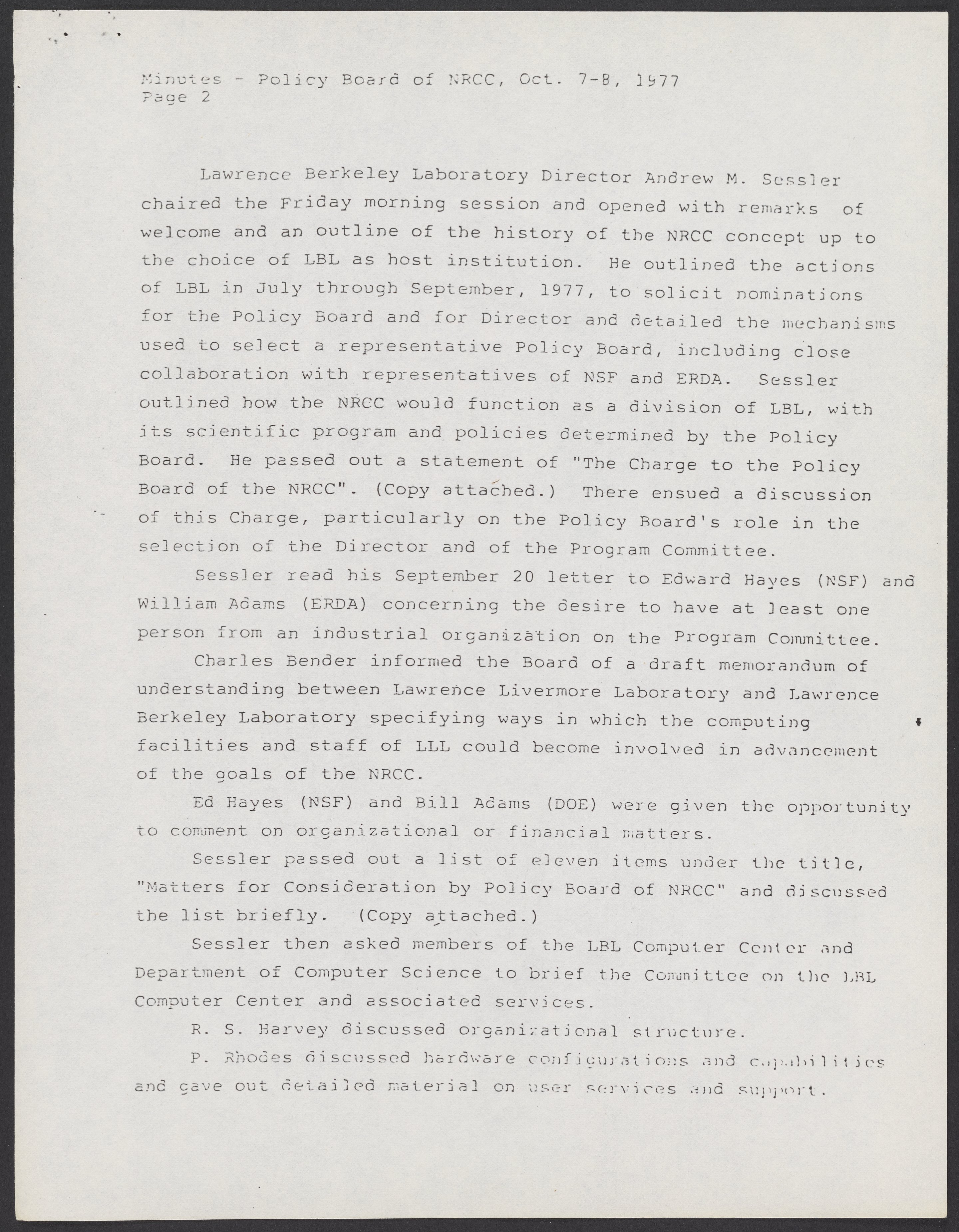 Small JPG1200 x 1535px — 260 KBLarge JPG2880 x 3685px — 1.4 MBFull-sized JPG5414 x 6927px — 4.9 MBOriginal fileTIFF — 5414 x 6927px — 107 MBMeeting minutes of the first meeting of the policy board of the National Resource for Computation in Chemistry (NRCC), held at the Lawrence Berkeley Laboratory on October 8, 1977. Included are outlines of the responsibilities of the policy board of the NRCC.