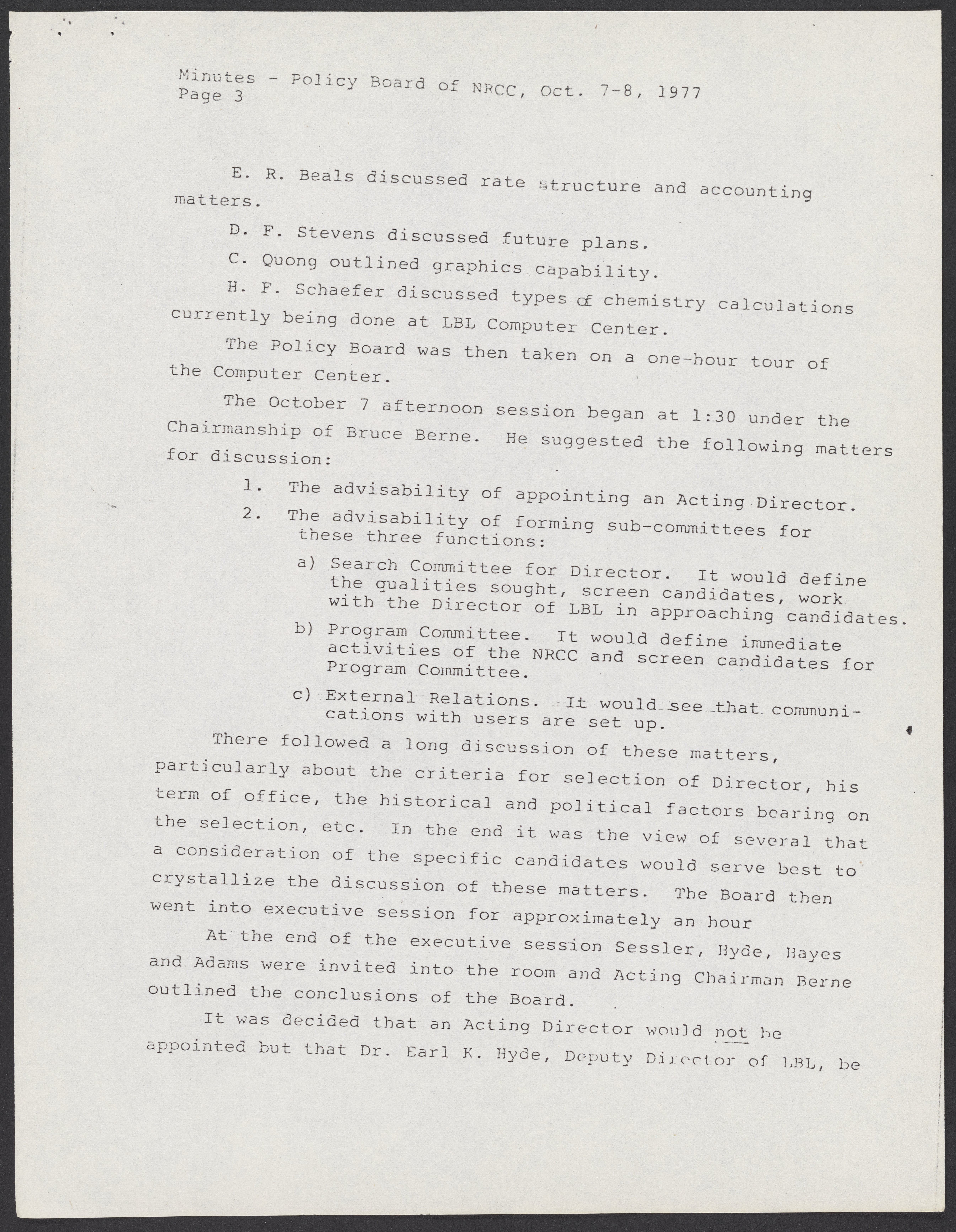 Lawrence Berkeley Laboratory. National Resource for Computation in Chemistry. “Minutes of the Meeting of the Policy Board of the National Resource for Computation in Chemistry, October 1977,” October 8, 1977. William A. Lester, Jr. Papers, Box 14, Folder 4. Science History Institute. Philadelphia. https://digital.sciencehistory.org/works/d1thivn.