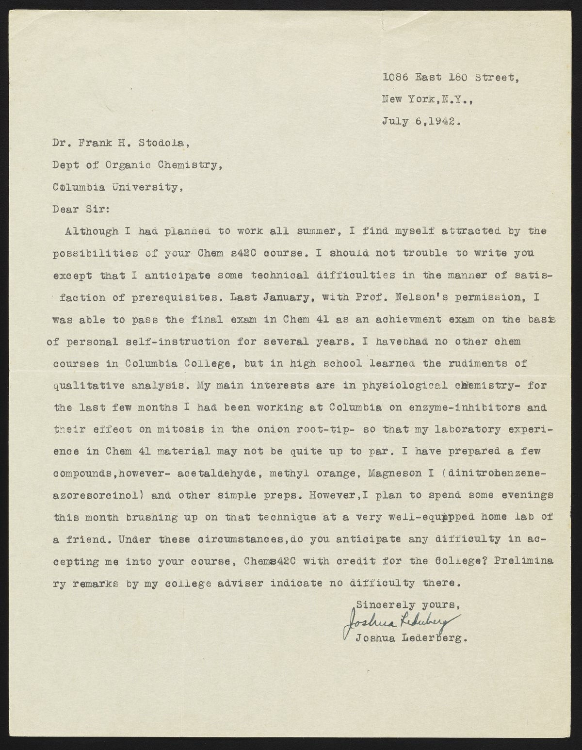 Written by Joshua Lederberg while 17 years old, seeking permission to take Stodola's Chem s42C course, despite not having taken the necessary prerequisites.