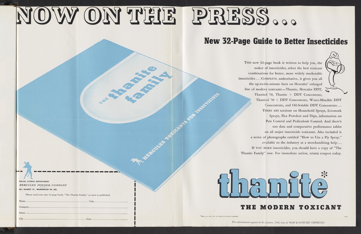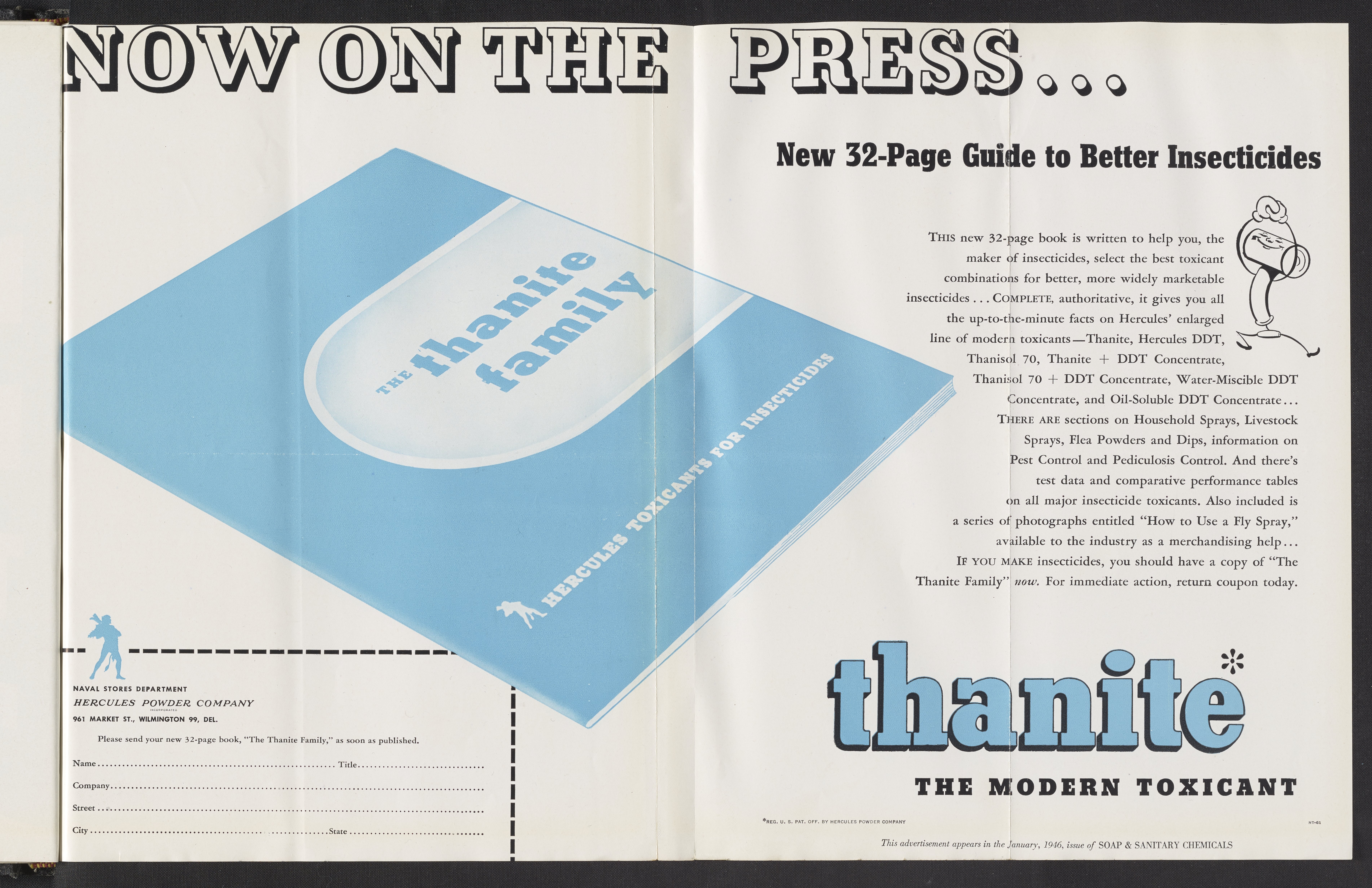 Hercules Incorporated. “Now on the Press...New 32-Page Guide to Better Insecticides.” 1945 Hercules Advertisements, 1945. Records of Hercules Incorporated, Volume 1945. Science History Institute. Philadelphia. https://digital.sciencehistory.org/works/d217qq34d.
