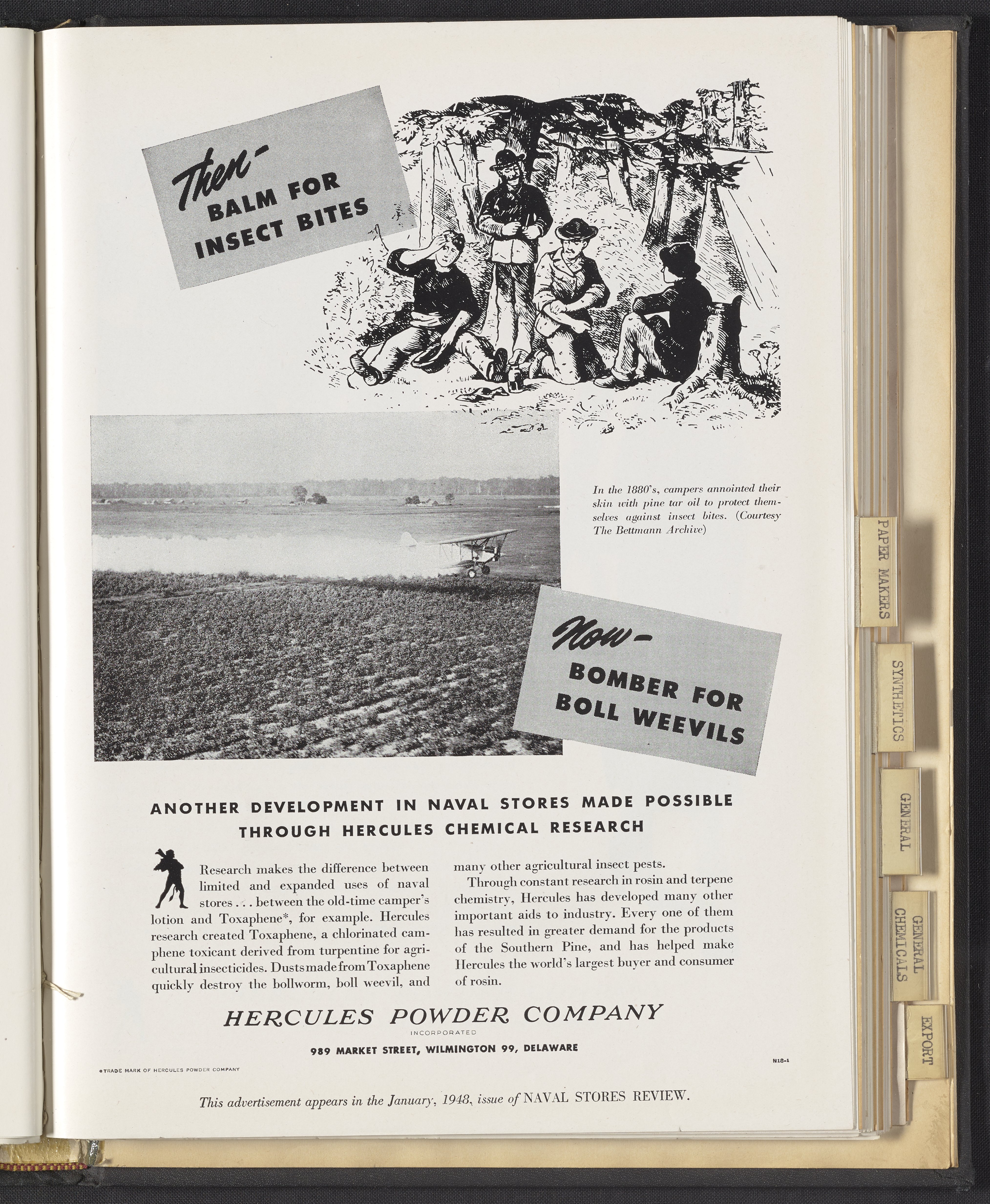 Hercules Incorporated. “Then, Balm for Insect Bites...Now, Bomber for Boll Weevils.” 1948 Hercules Advertisements, 1948. Records of Hercules Incorporated, Volume 1948. Science History Institute. Philadelphia. https://digital.sciencehistory.org/works/d217qq35p.