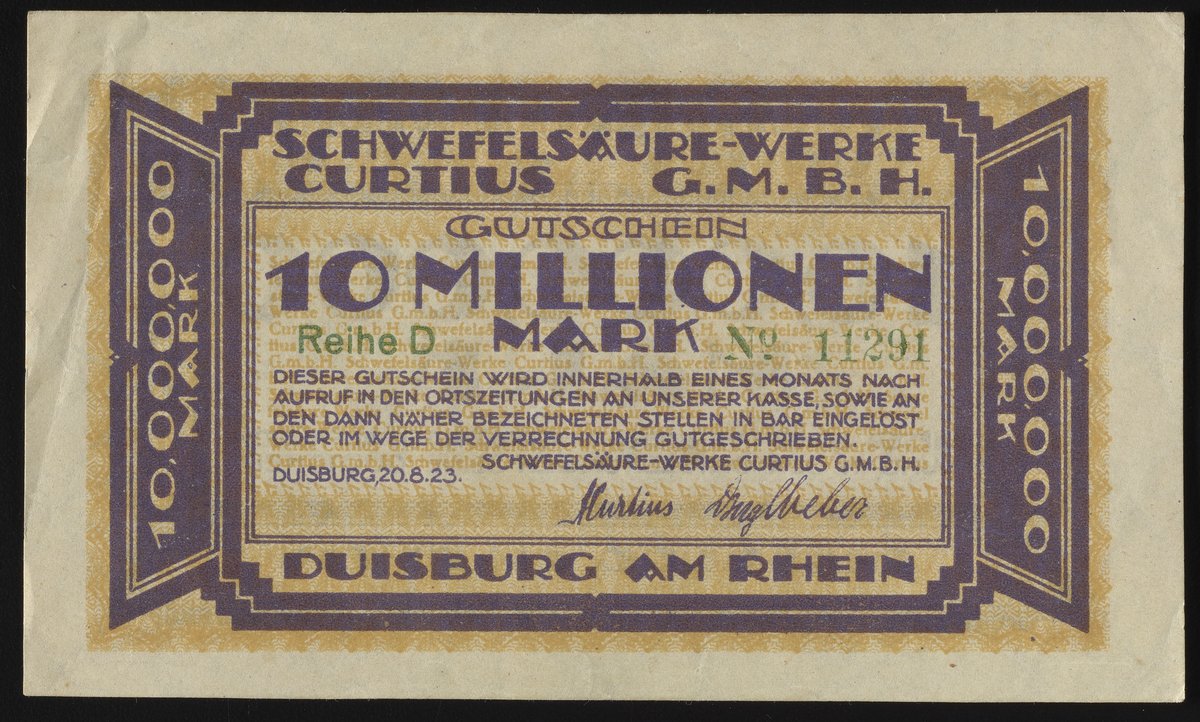 Small JPG1200 x 722px — 220 KBLarge JPG2880 x 1732px — 1.2 MBFull-sized JPG4095 x 2463px — 2.1 MBOriginal fileTIFF — 4095 x 2463px — 28.9 MBThis Ten Millionen Mark Gutschein, or ten million Mark voucher, was issued by Schwefelsäure-Werke Curtius GmbH, or Curtius Sulfuric Acid Works GmbH. Paper features a watermark design.