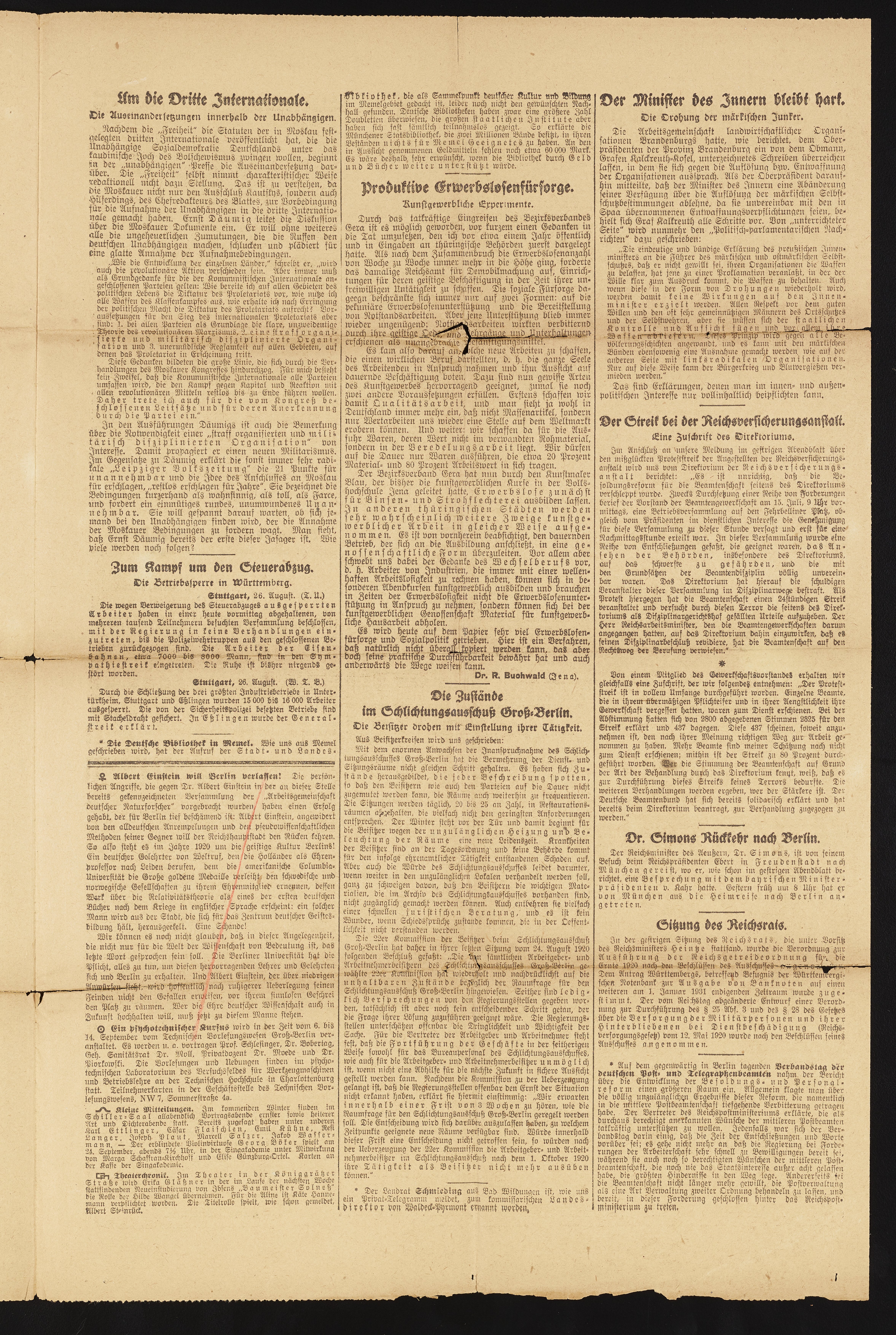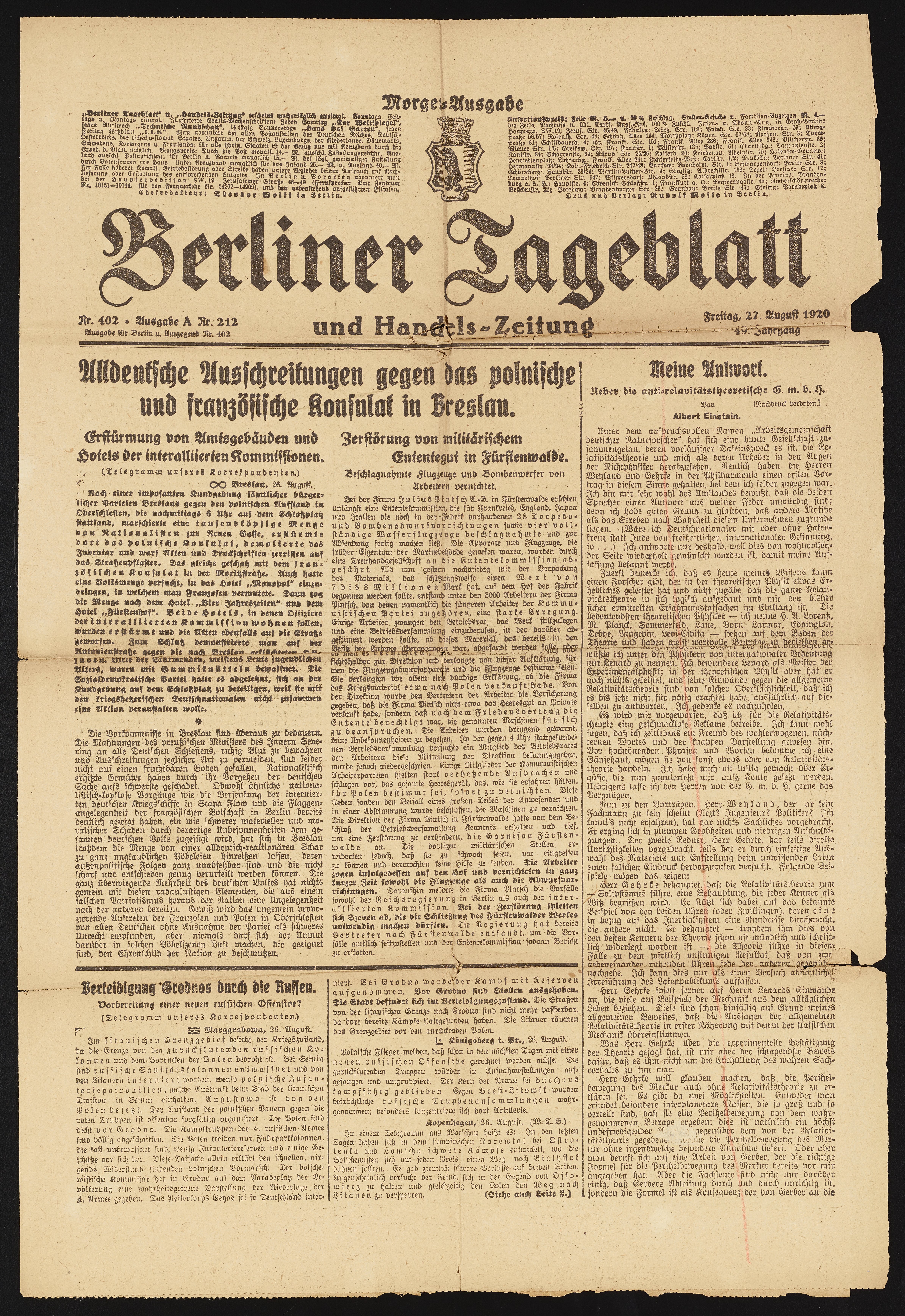 Meine Antwort. Ueber die anti-relavitat theoretische by Albert Einstein in the Berliner Tageblatt