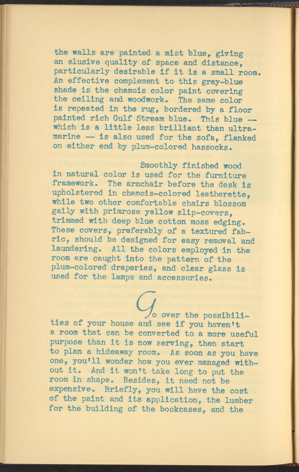 Booklet corresponding to a radio broadcast program created by the National Paint, Varnish, and Lacquer Association. The booklet begins by introducing the concept of a "hideaway room," or a space in one's home for independent focus and separation from the rest of the household. Provides inspiration for decorating a hideaway room, emphasizing qualities determined to be masculine. Includes small stylized illustrations throughout and decorated covers.
