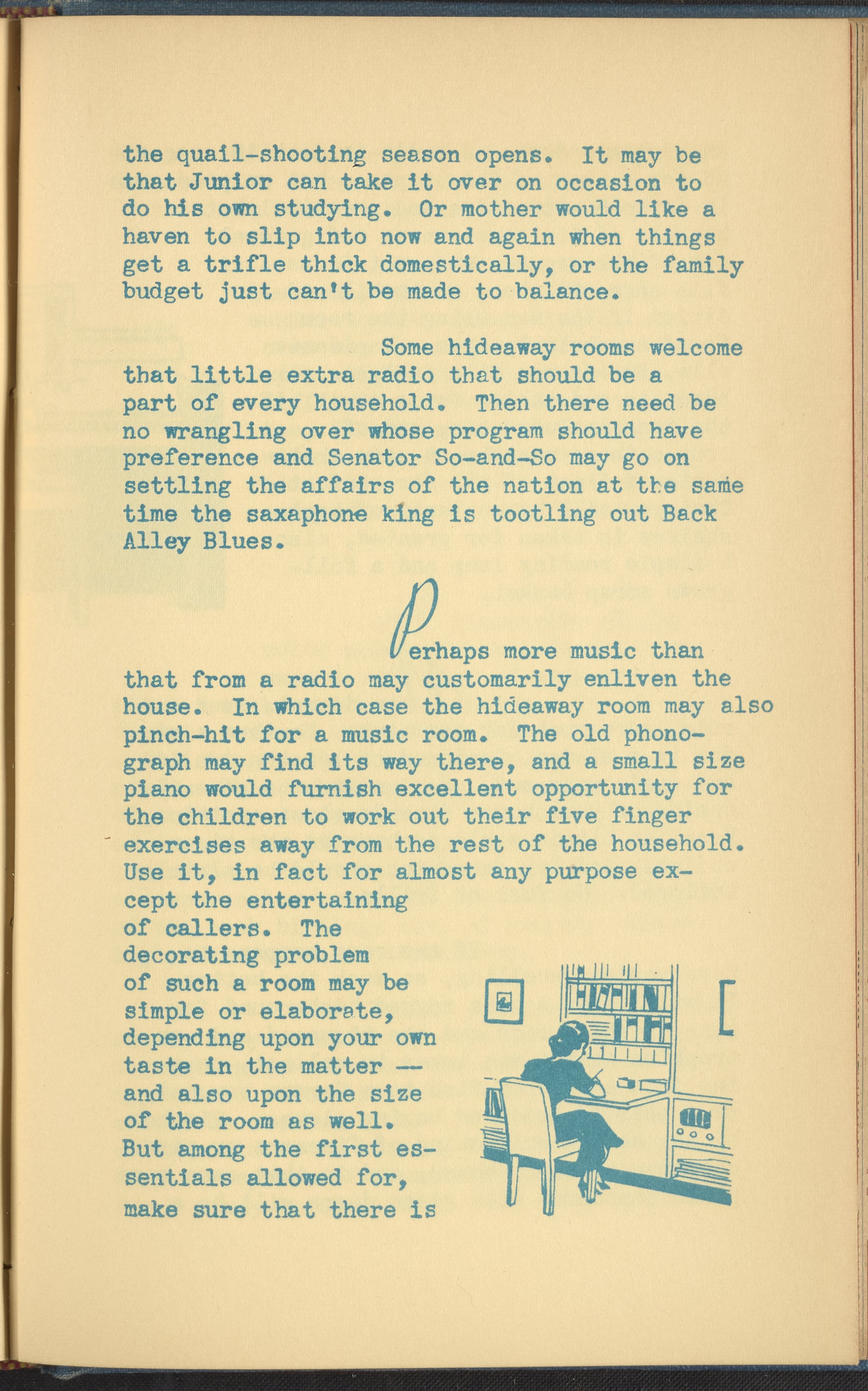 Booklet corresponding to a radio broadcast program created by the National Paint, Varnish, and Lacquer Association. The booklet begins by introducing the concept of a "hideaway room," or a space in one's home for independent focus and separation from the rest of the household. Provides inspiration for decorating a hideaway room, emphasizing qualities determined to be masculine. Includes small stylized illustrations throughout and decorated covers.