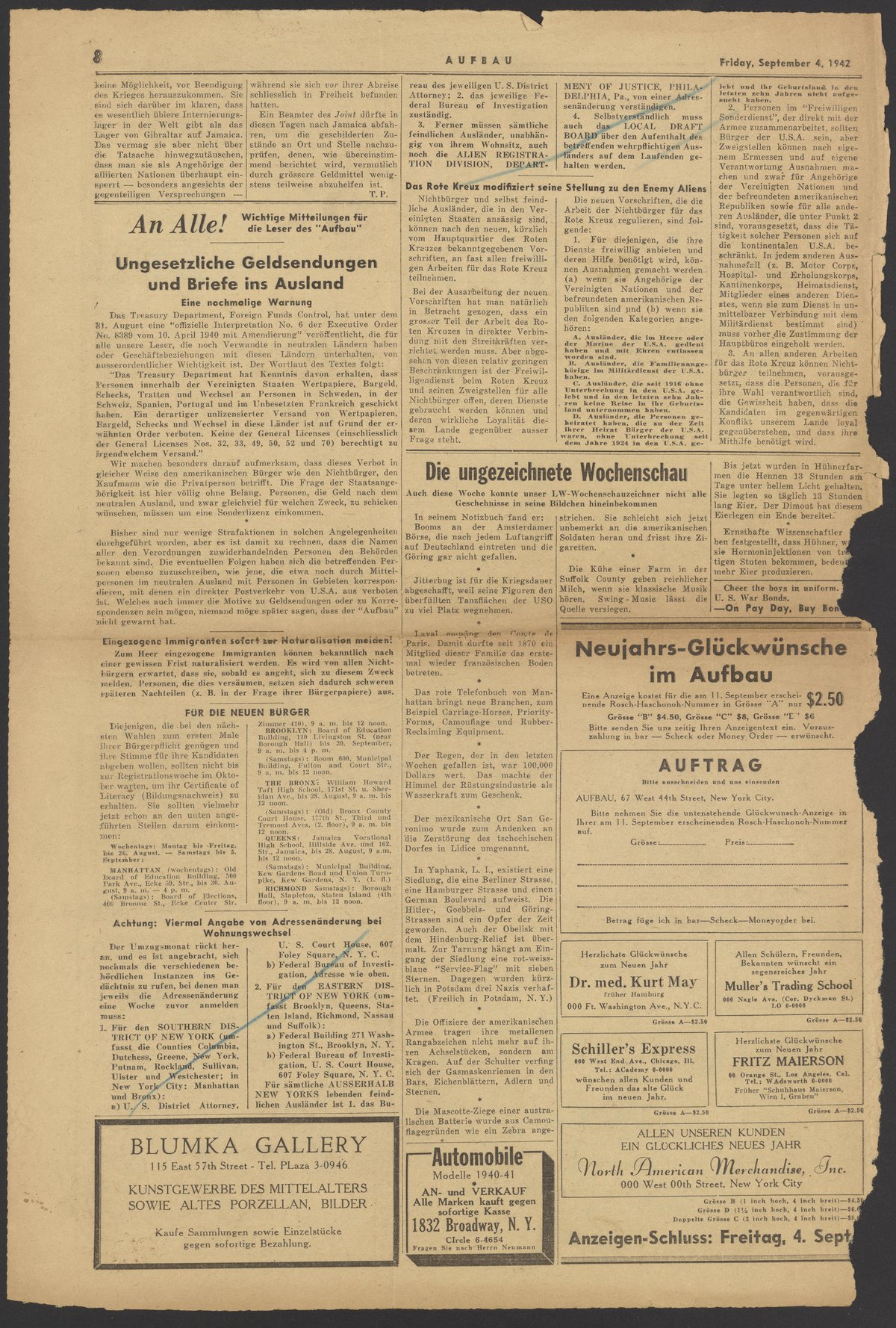 Notice to the readers in Aufbau, a newspaper for Jewish-German immigrants. Max Albert Bredig (1902-1977) has highlighted a section titled Binoculars. Bredig would eventually attempt to donate binoculars to the U.S. Army and Navy.