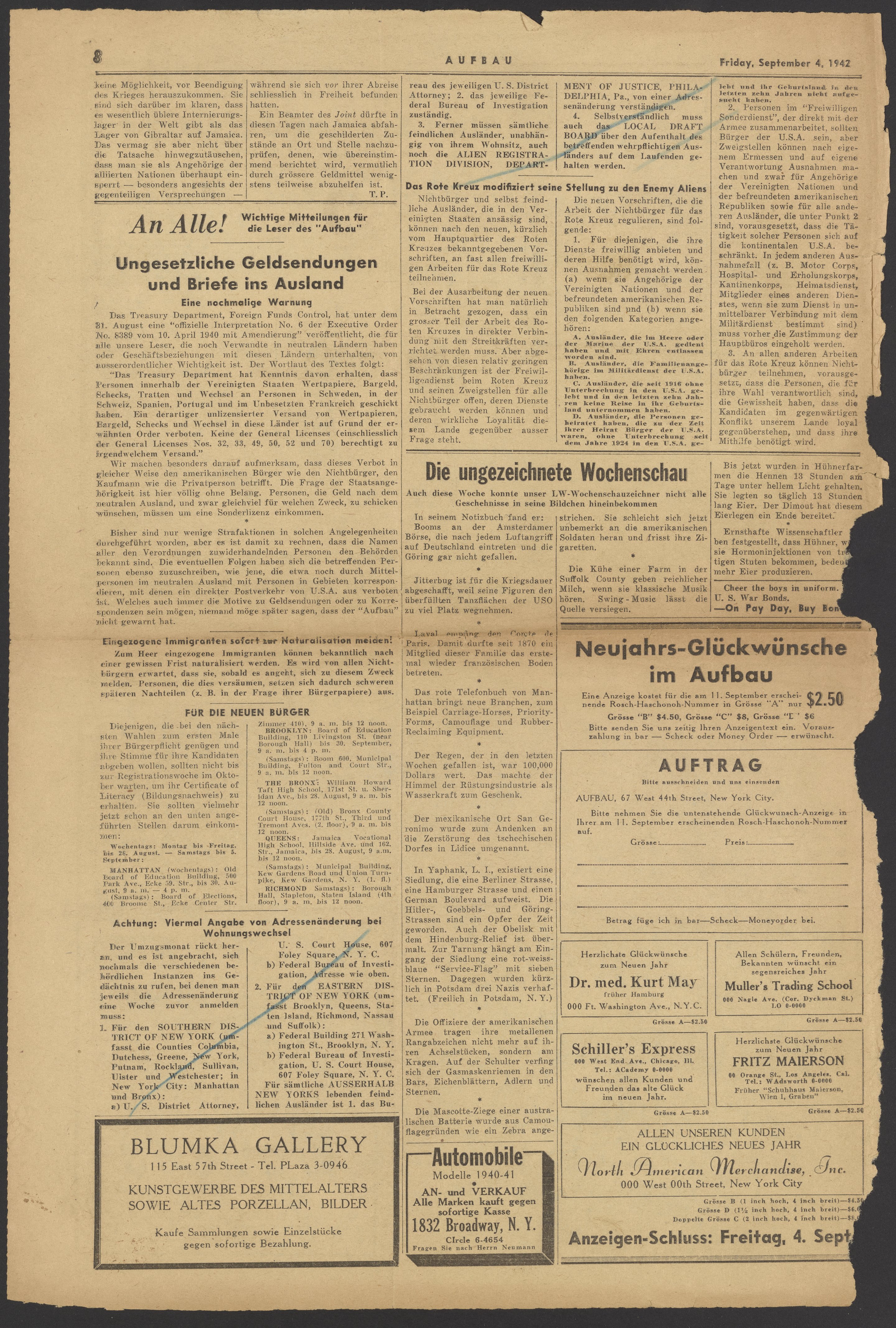 “An Alle! Wichtige Mitteilungen Für DieLeser Des ‘Aufbau,’” March 6, 1942. Papers of Georg and Max Bredig, Box 10, Folder 26. Science History Institute. Philadelphia. https://digital.sciencehistory.org/works/d501wif.