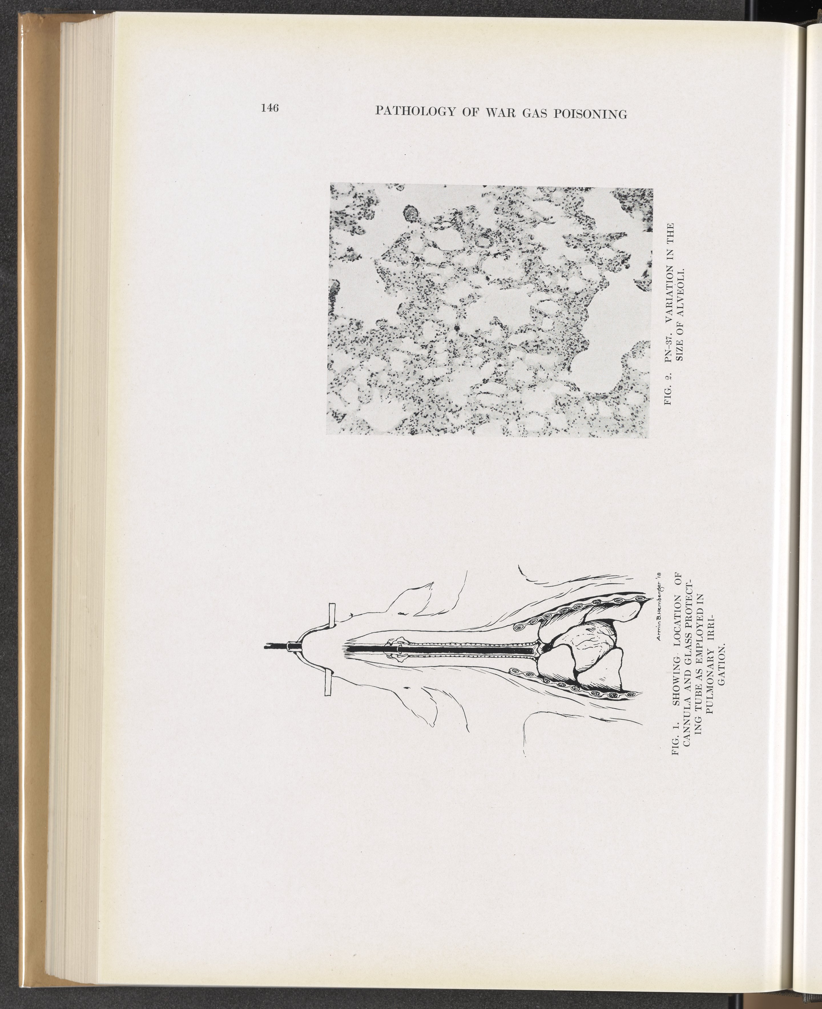 Winternitz, M. C. (Milton C.). “Fig. 1: Showing Location of Cannula and Glass Protecting Tube as Employed in Pulmonary Irrigation. Fig. 2: Variation in Size of Alveoli.” Collected Studies on the Pathology of War Gas Poisoning. New Haven, Connecticut: Yale University Press, 1920. https://digital.sciencehistory.org/works/d504rk513.