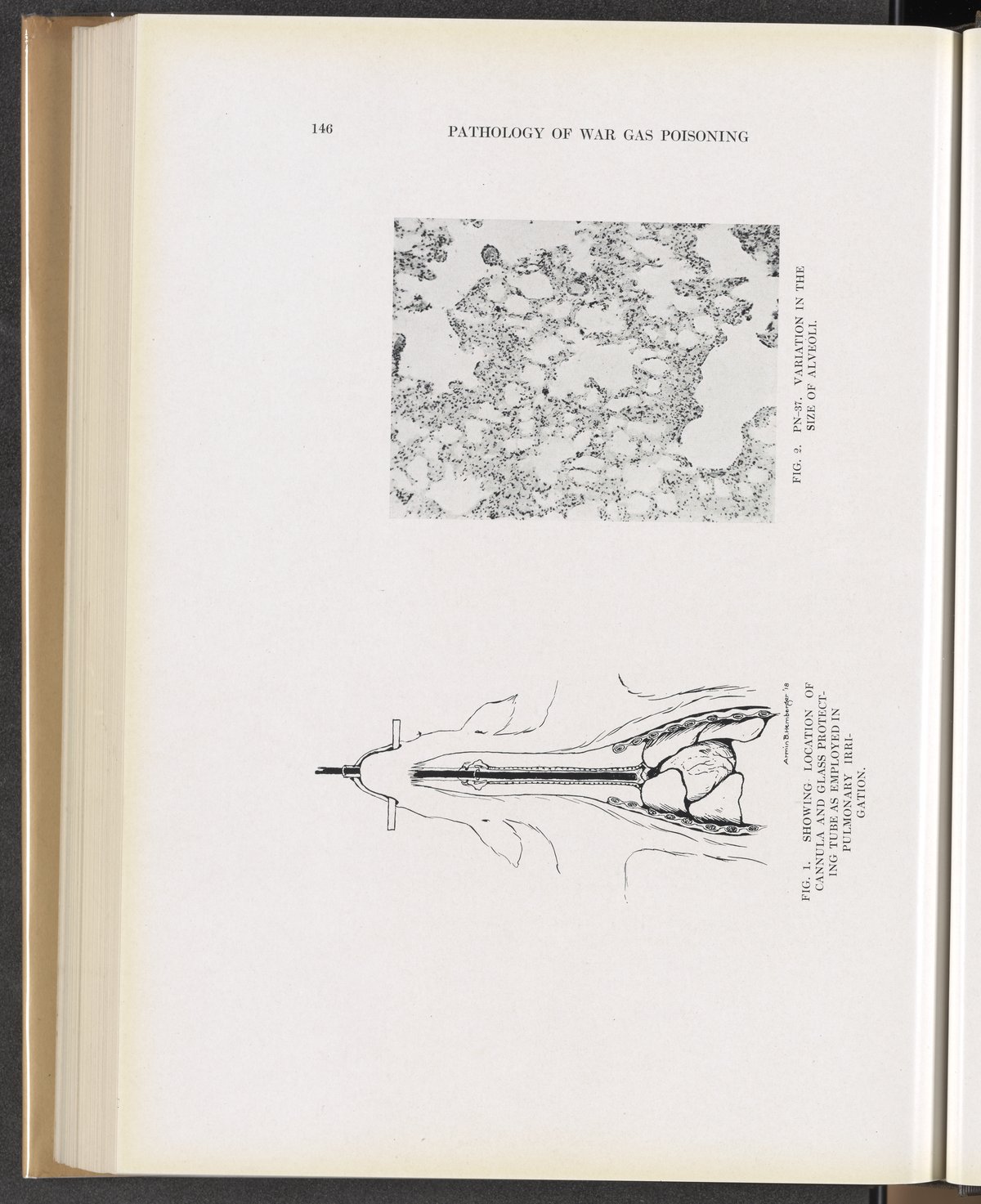 Fig. 1: Showing location of cannula and glass protecting tube as employed in pulmonary irrigation. Fig. 2: Variation in size of alveoli