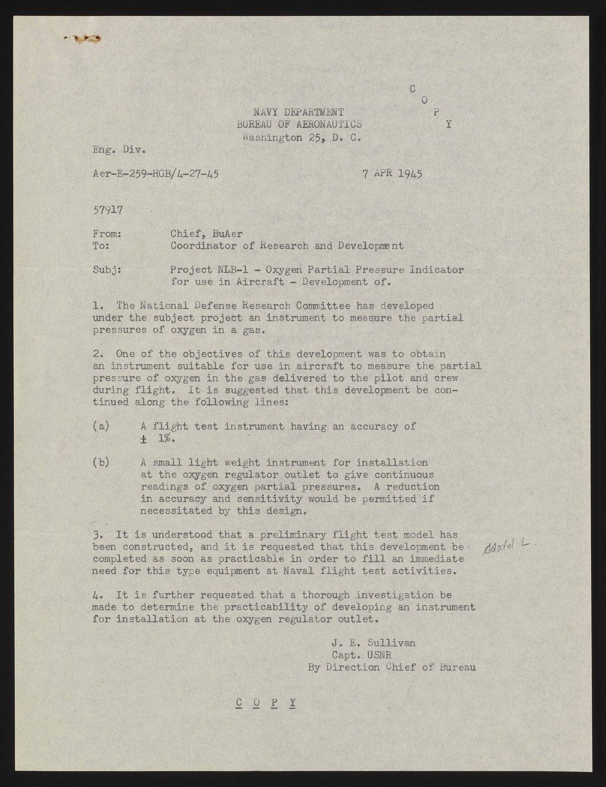 Letter from J. E. Sullivan to the Coordinator of Research and Development