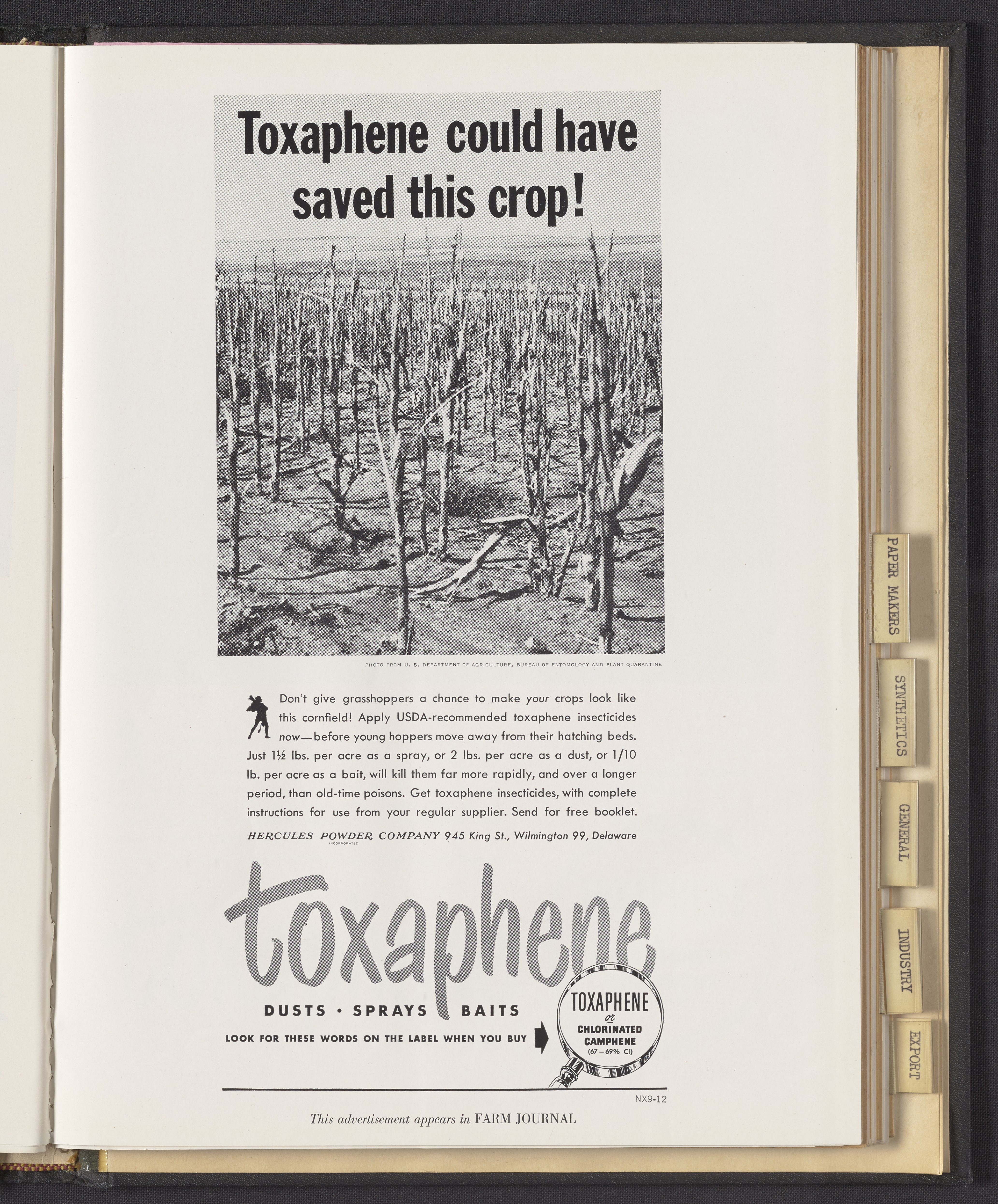Hercules Incorporated. “Toxaphene Could Have Saved This Crop!” 1949 Hercules Advertisements, 1949. Records of Hercules Incorporated, Volume 1949. Science History Institute. Philadelphia. https://digital.sciencehistory.org/works/d504rm00t.