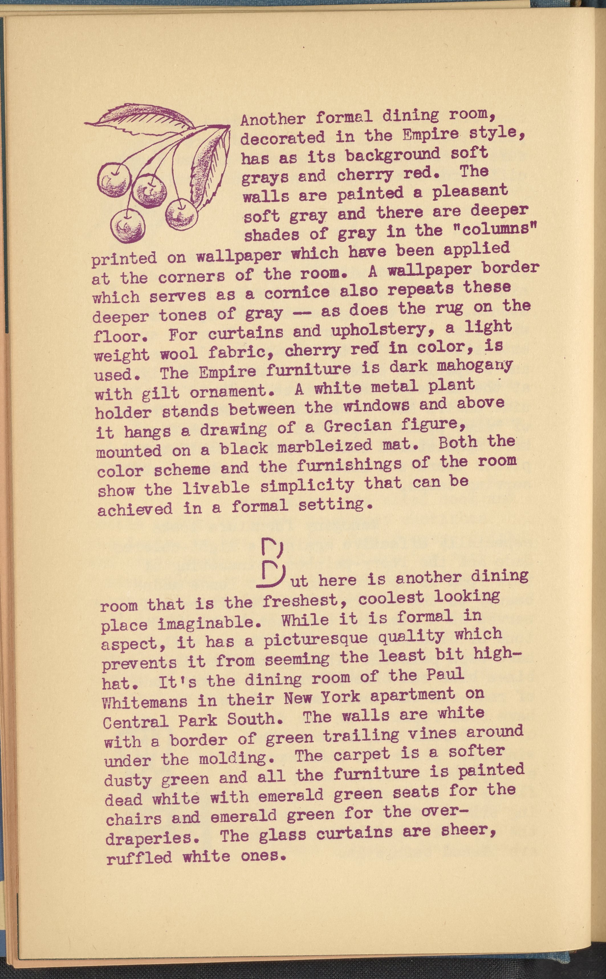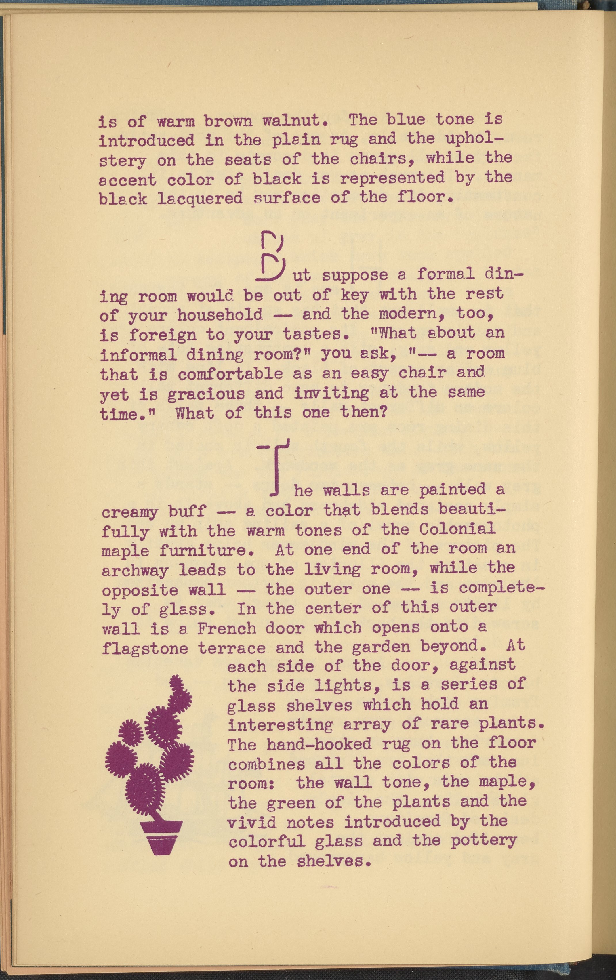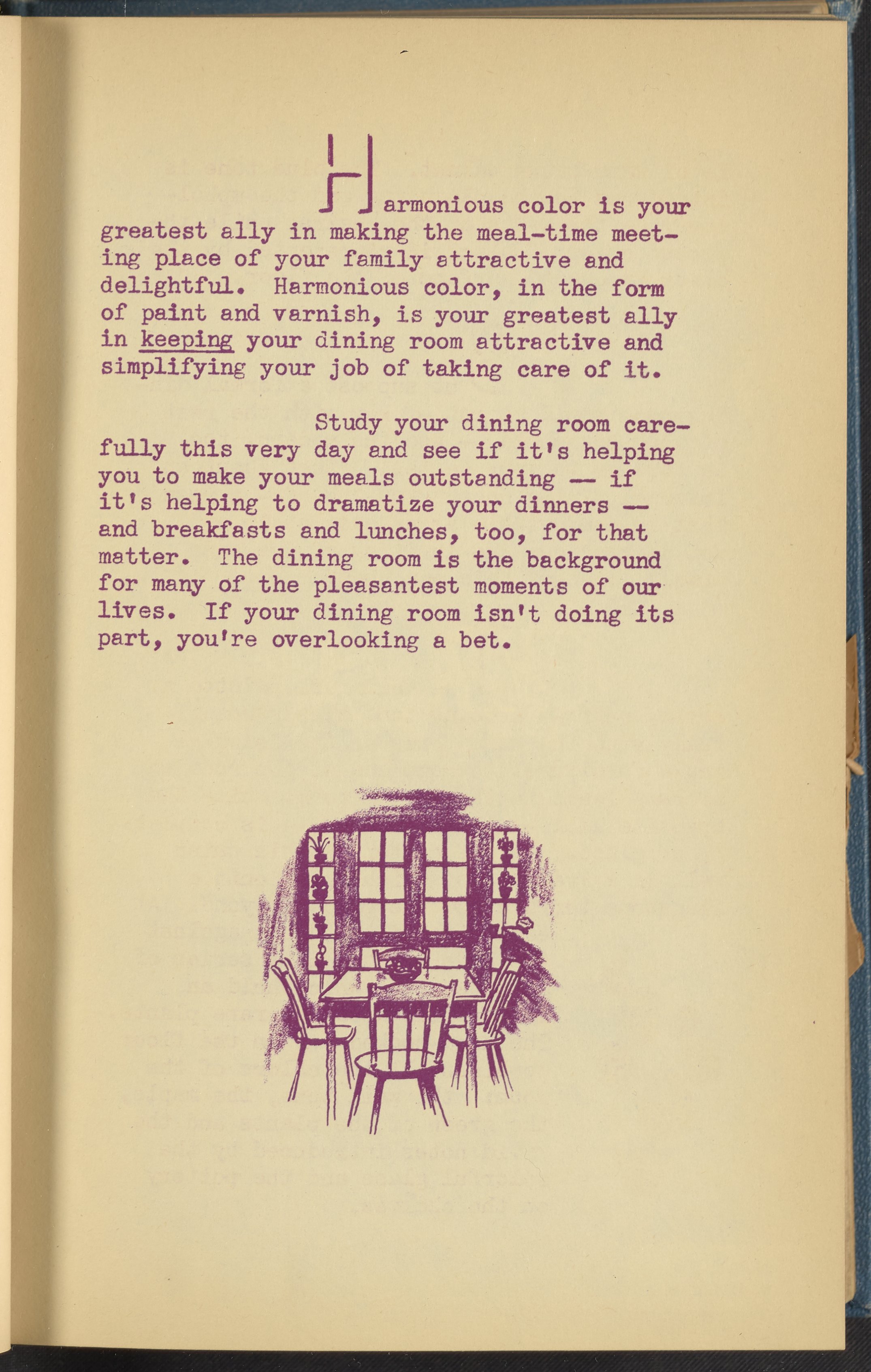 Booklet corresponding to a radio broadcast program created by the National Paint, Varnish, and Lacquer Association. The booklet discusses how an attractively decorated dining room not only aids in digestion but also deepens the love in a home by making mealtimes pleasant. Provides tips for decorating a dining room and describes the defining features of several differently styled dining rooms for inspiration. Includes small stylized illustrations throughout and decorated covers.