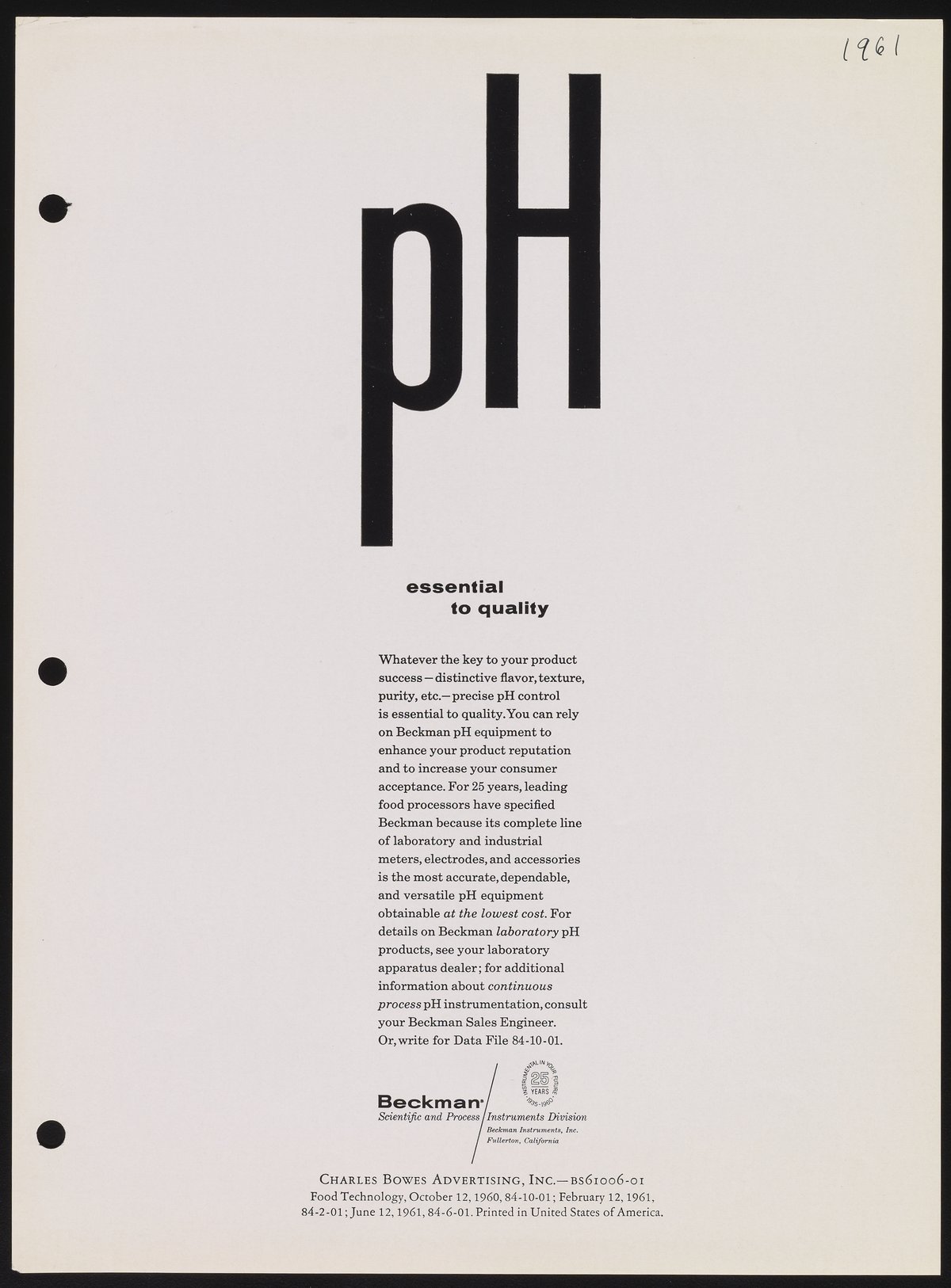 Charles Bowes Advertising, and Inc. Beckman Instruments. “PH Essential to Quality,” 1961. Beckman Historical Collection, Box 49, Folder 19. Science History Institute. Philadelphia. https://digital.sciencehistory.org/works/d791sg170.