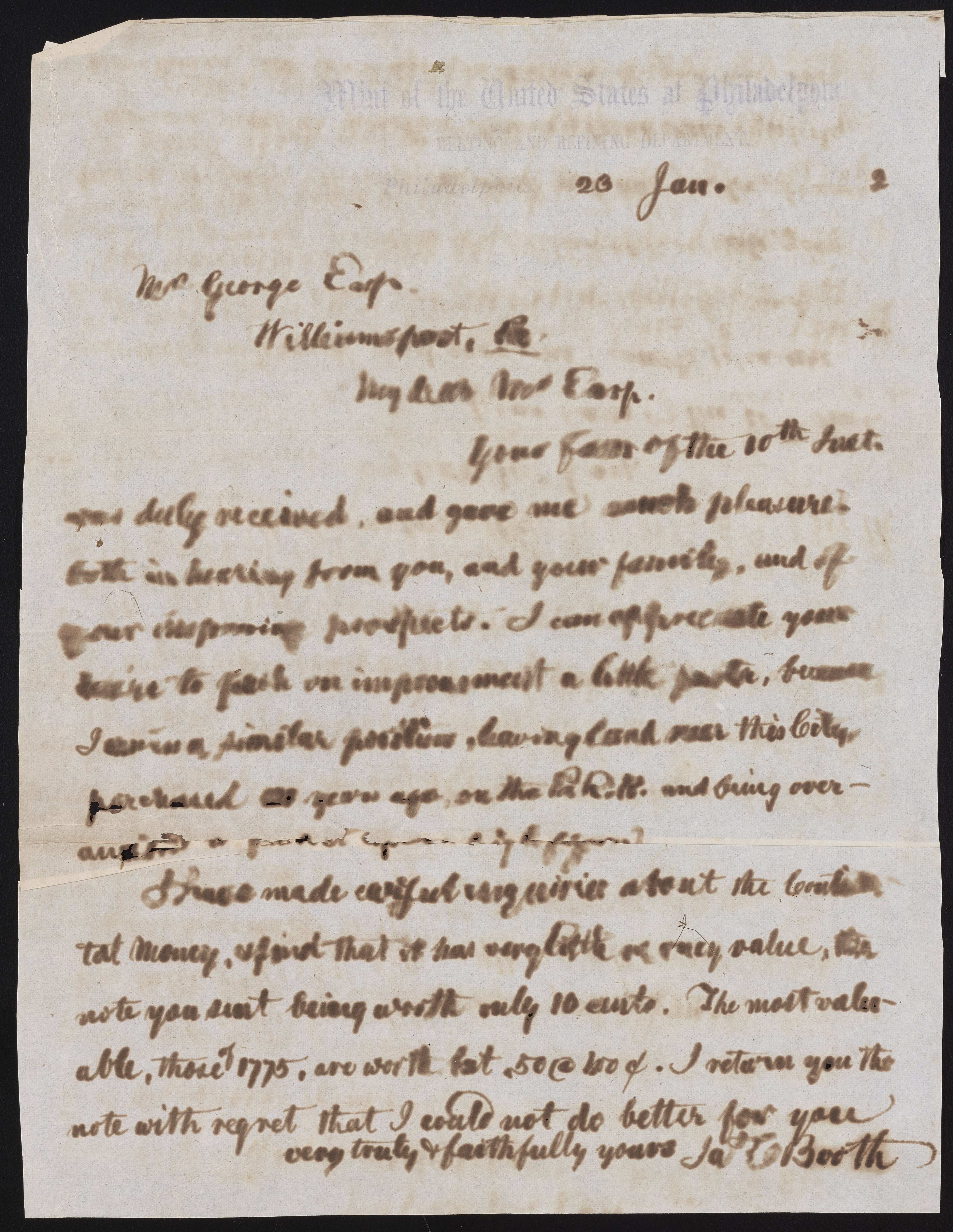 James Curtis Booth (1810-1888) writes to Mrs. George Earp regarding the value of an old banknote.