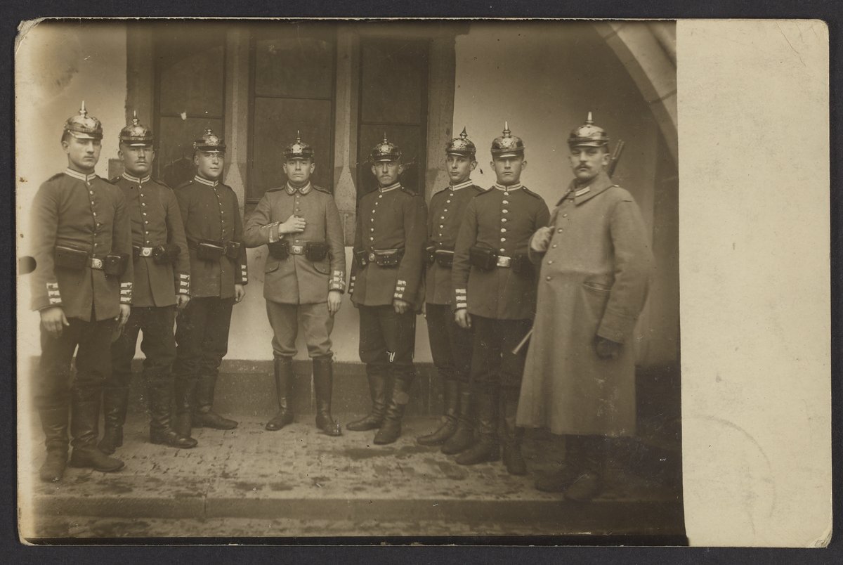 Small JPG1200 x 804px — 128 KBLarge JPG2880 x 1930px — 590 KBFull-sized JPG3506 x 2350px — 828 KBOriginal fileTIFF — 3506 x 2350px — 23.6 MBPostcard from Max Mislow (1887-1963), Kurt Mislow's (1923-2017) father, to an unknown recipient. The postcard features a black and white photograph of German soldiers wearing Pickelhauben, the pointed or spiked helmet worn by Prussian and German soldiers, firefighters, and police officers during the 19th and 20th centuries. Max Mislow is on the far right, wearing a woolen coat.