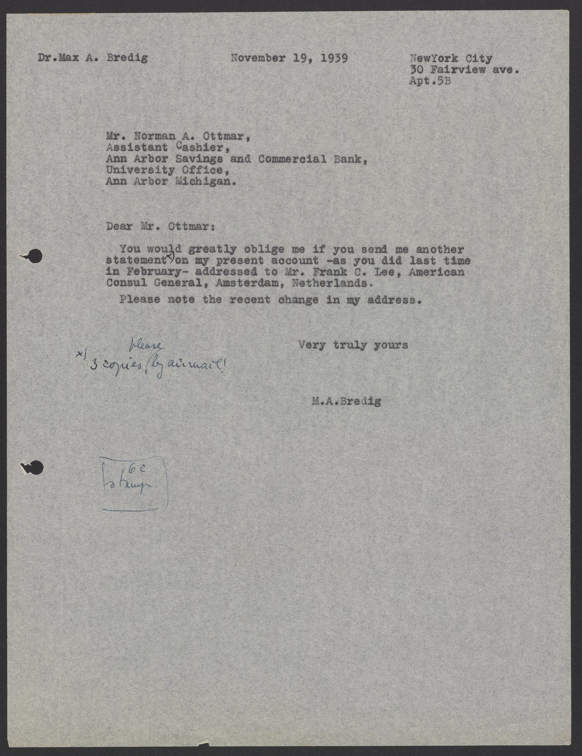 Letter from Max Bredig to Norman A. Ottmar, November 19, 1939