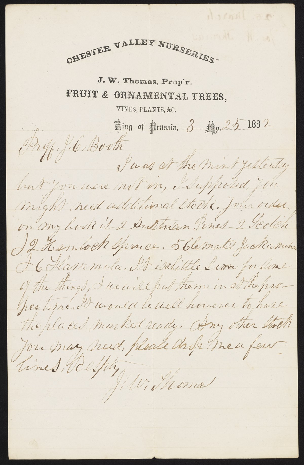 Thomas, Joseph W. “Letter from J.W. Thomas to James Curtis Booth, March 25, 1882,” March 25, 1882. Papers of James Curtis Booth, Box 2, Folder 10. Science History Institute. Philadelphia. https://digital.sciencehistory.org/works/dangiyr.