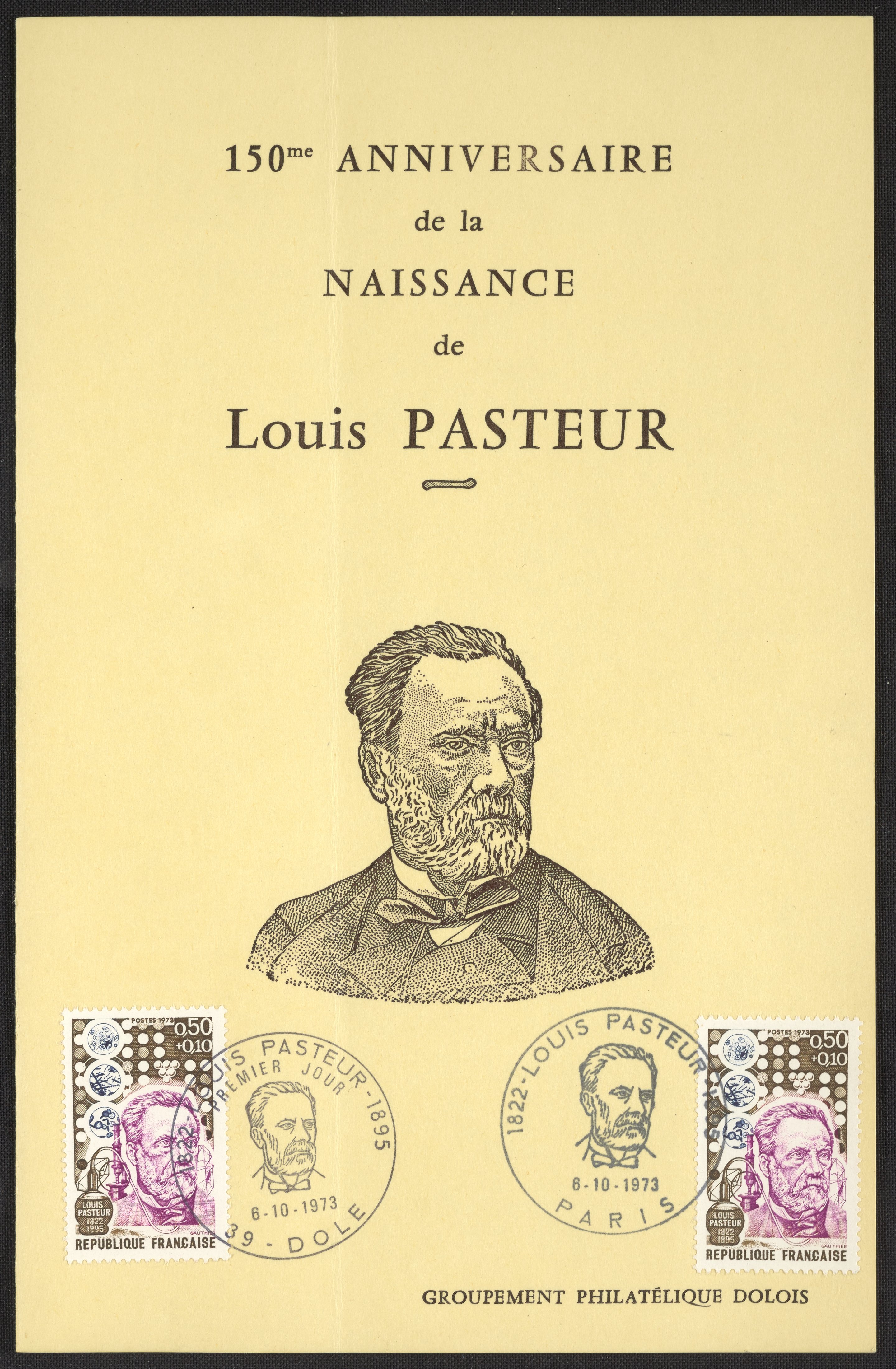 Small JPG1200 x 1833px — 359 KBLarge JPG2880 x 4400px — 1.8 MBFull-sized JPG3415 x 5217px — 2.4 MBOriginal fileTIFF — 3415 x 5217px — 51.0 MBSemipostal stamps commemorating the 150th anniversary of the birth of Louis Pasteur. Includes two postmarks depicting Pasteur, with Pasteur also featured on the first day of issue cancel. A semipostal stamp is a postage stamp issued to raise money for a particular purpose (such as a charitable cause) and sold at a premium over the postal value.