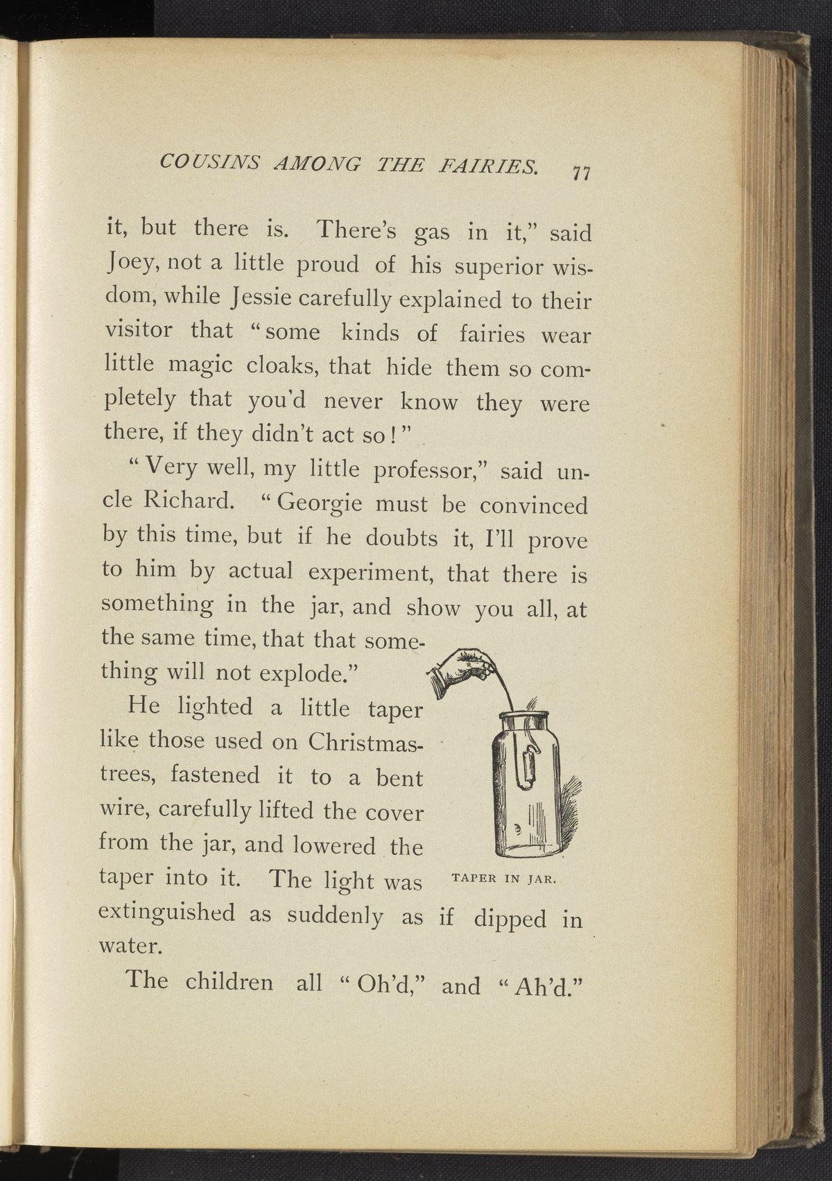 Meyer, Lucy Rider. “Taper in Jar.” Real Fairy Folks, or, Fairy Land of Chemistry: Explorations in the World of Atoms. Boston, Massachusetts: Lothrop Publishing Company, 1887. https://digital.sciencehistory.org/works/db78tc46z.