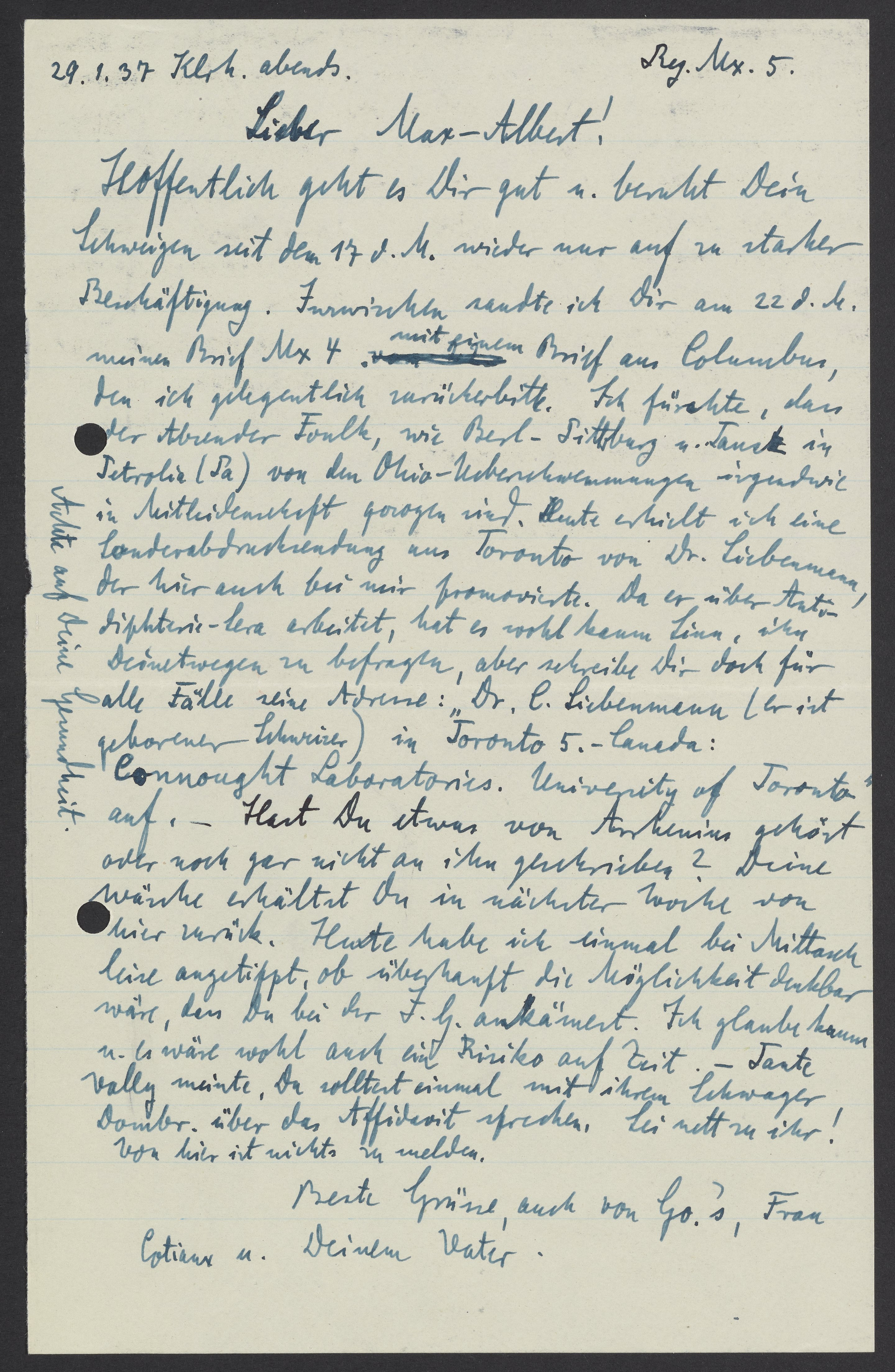 I hope you are doing well and your silence since the 17th of this month is on account of your many commitments. In the meantime, I sent you a letter on the 22nd of this month, my Mx 4 letter, as well as a letter from Columbus, which I ask that you return. I fear that the sender, Foulk, as well as Berl in Pittsburgh and Tausz in Petrolia (Pennsylvania), were somehow affected by the Ohio floods. Today, I received an offprint from Dr. Siebenmann in Toronto, whose doctoral thesis I supervised here. Since he works on antiserum and diphtheria serums, it’s hardly worth consulting him on your behalf. However, just in case, I will share his address with you: Dr. C. Siebenmann (he’s a native Swiss), Toronto 5, Canada, Connaught Laboratories, University of Toronto. Have you heard anything from Arrhenius, or have you not yet written to him? You will receive your laundry next week. Today, I gently asked Mittasch if it would be conceivable for you to join I.G. I really don’t think so and it would be a risk of valuable time. Aunt Vally said that you should talk with her brother-in-law, Mr. Dombrowsky, about the affidavit. Be nice to her! I don’t have any news.