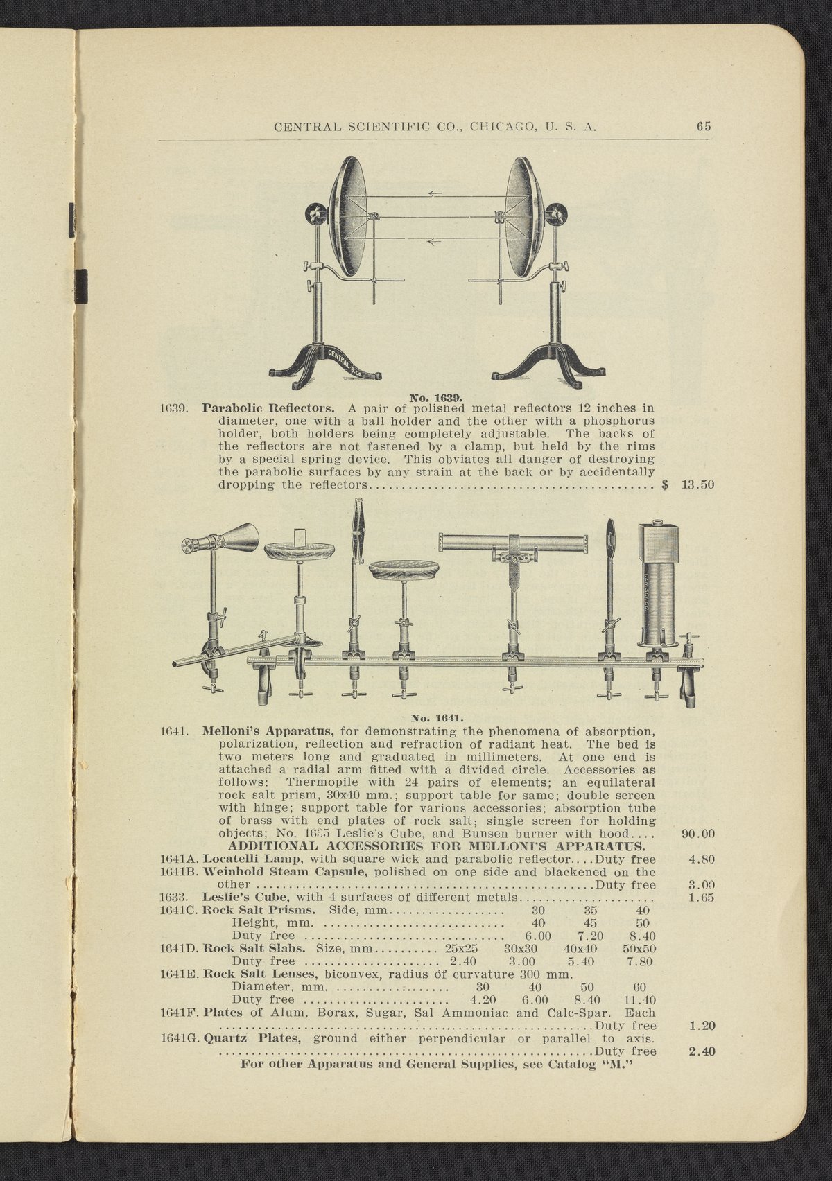 Central Scientific Company. “Melloni's Apparatus and Parabolic Reflectors.” Physical Apparatus for Universities and Colleges Manufactured and Imported by Central Scientific Co. Chicago, Illinois: Central Scientific Company, 1912. Q185.7 .C46 1912. Science History Institute. Philadelphia. https://digital.sciencehistory.org/works/dbbzy3b.