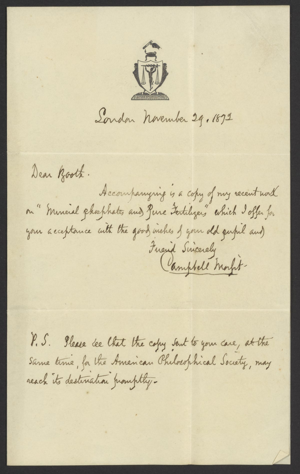 Morfit, Campbell. “Letter from Campbell Morfit to James Curtis Booth, November 29, 1872,” November 29, 1872. Papers of James Curtis Booth, Box 1, Folder 10. Science History Institute. Philadelphia. https://digital.sciencehistory.org/works/dck2llc.