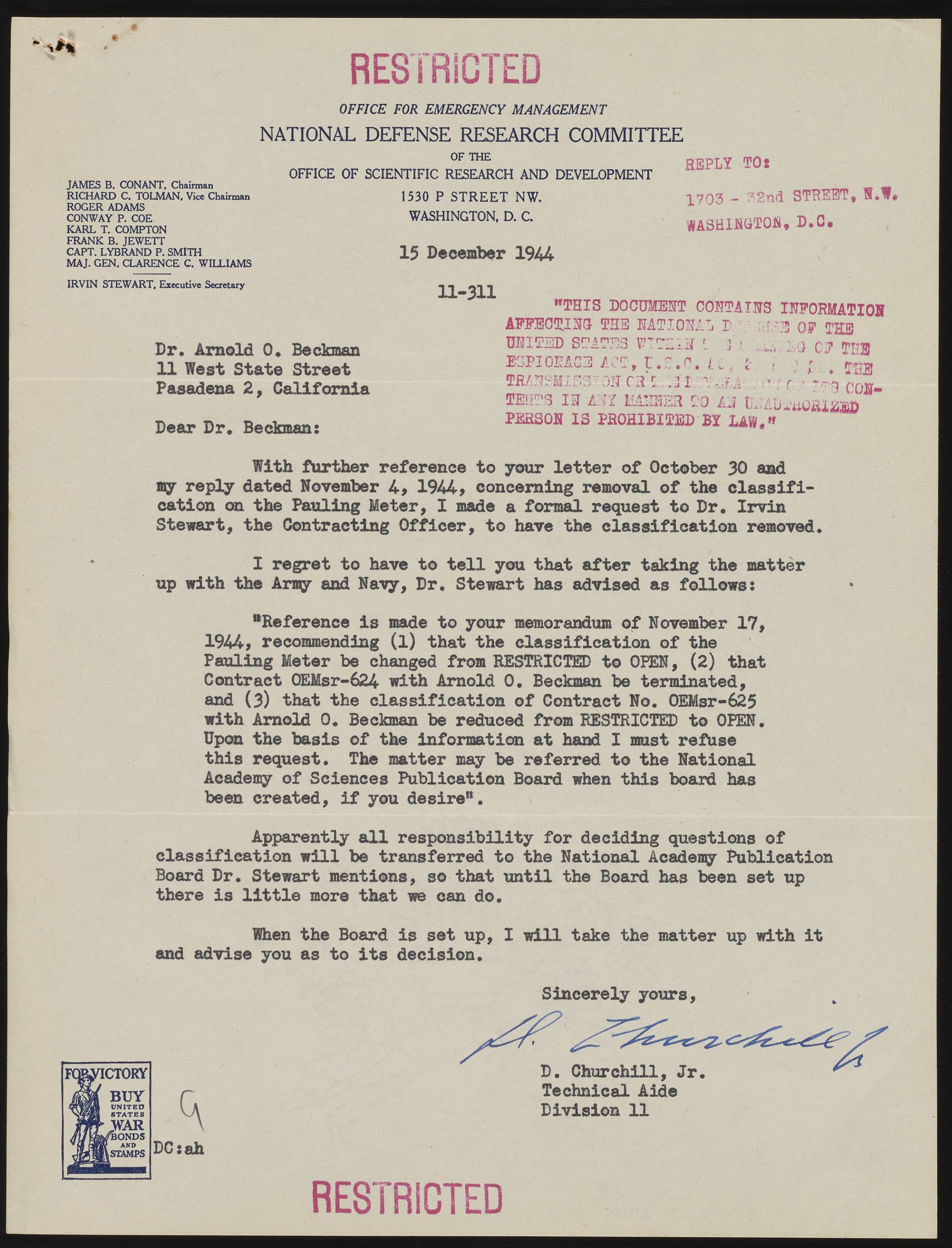 Letter from Durand Churchill, Jr. to Arnold O. Beckman