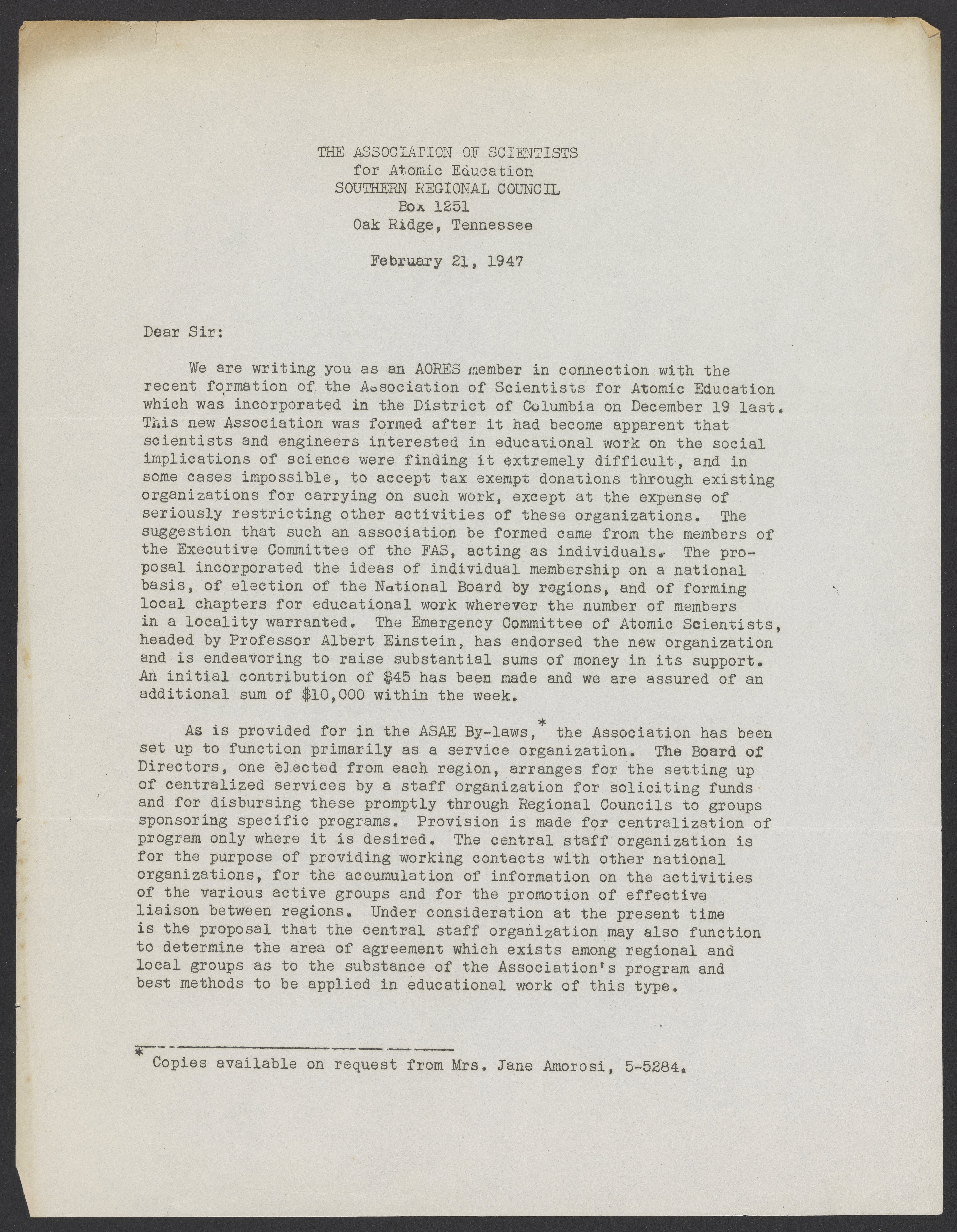Informational letter about the Association of Scientists for Atomic Education