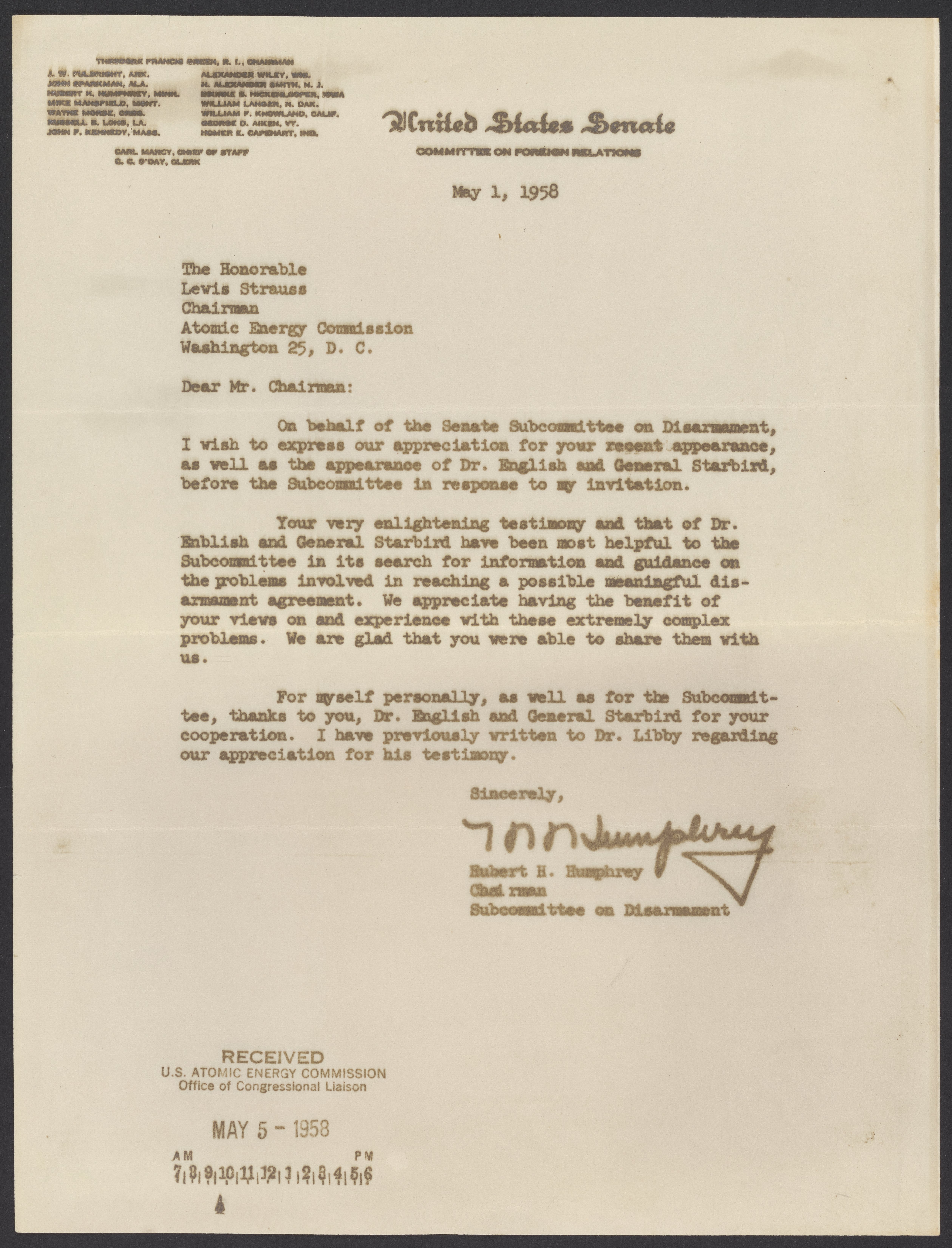 Letter from Hubert H. Humphrey to Lewis Strauss, May 1, 1958