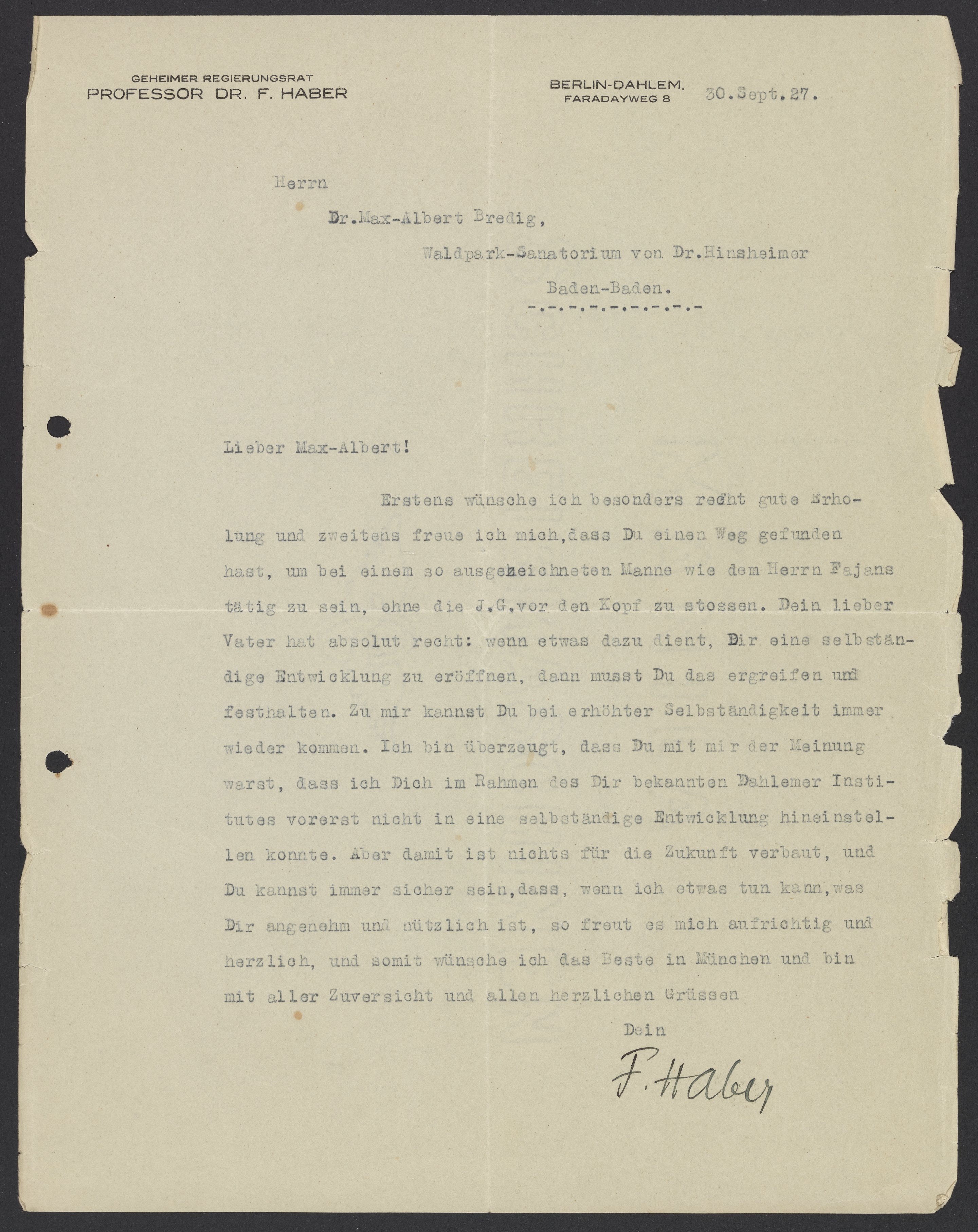 Erstens wünsche ich besonders recht gute Erholung und zweitens freue ich mich, dass Du einen Weg gefunden hast, um bei einem so ausgezeichneten Manne wie dem Herrn Fajans tätig zu sein, ohne die I.G. vor den Kopf zu stossen. Dein lieber Vater hat absolut recht: wenn etwas dazu dient, Dir eine selbstständige Entwicklung zu eröffnen, dann musst Du das ergreifen und festhalten. Zu mir kannst Du bei erhöhter Selbstständigkeit immer wieder kommen. Ich bin überzeugt, dass Du mit mir der Meinung warst, dass ich Dich im Rahmen des Dir bekannten Dahlemer Institutes nicht in eine selbstständige Entwicklung hineinstellen konnte. Aber damit ist nichts für die Zukunft verbaut, und Du kannst immer sicher sein, dass, wenn ich etwas tun kann, was Dir angenehm und nützlich ist, so freut es mich aufrichtig und herzlich, und somit wünsche ich das Beste in München und bin mit aller Zuversicht und allen herzlichen Grüssen