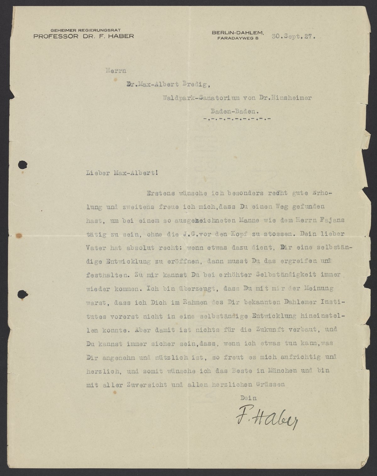 Letter from Fritz Haber to Max Bredig, September 30, 1927
