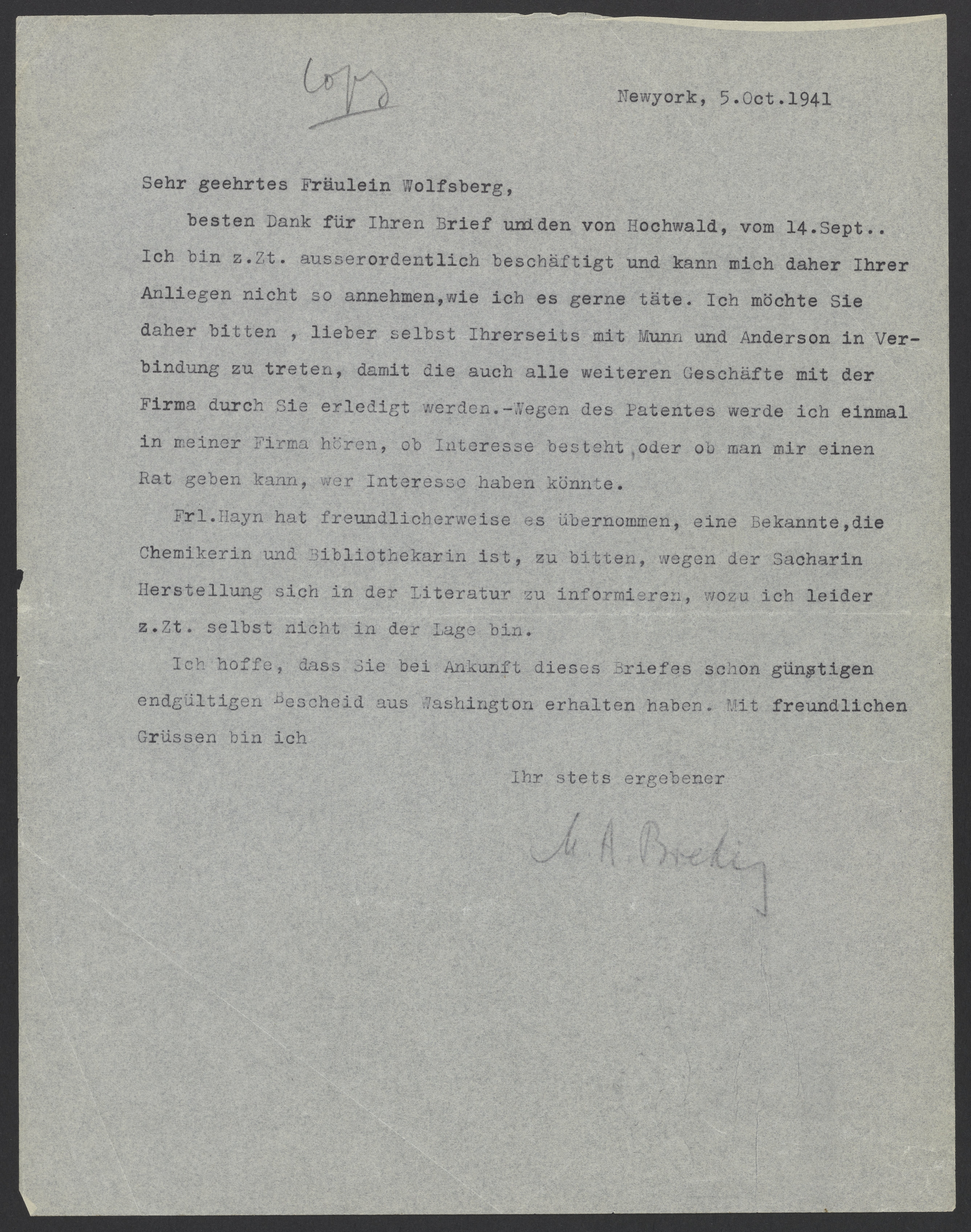 besten Dank für Ihren Brief und den von Hochwald, vom 14. Sept.. Ich bin z.Zt. ausserordentlich beschäftigt und kann mich daher Ihre Anliegen nicht so annehmen wie ich es gerne täte. Ich möchte Sie daher bitten, lieber selbst Ihrerseits mit Munn und Anderson in Verbindung zu treten, damit die auch alle weiteren Geschäfte mit der Firma durch Sie erledigt werden. – Wegen des Patentes werde ich einmal in meiner Firma hören, ob Interesse besteht, oder ob man mir einen Rat geben kann, wer Interesse haben könnte.
